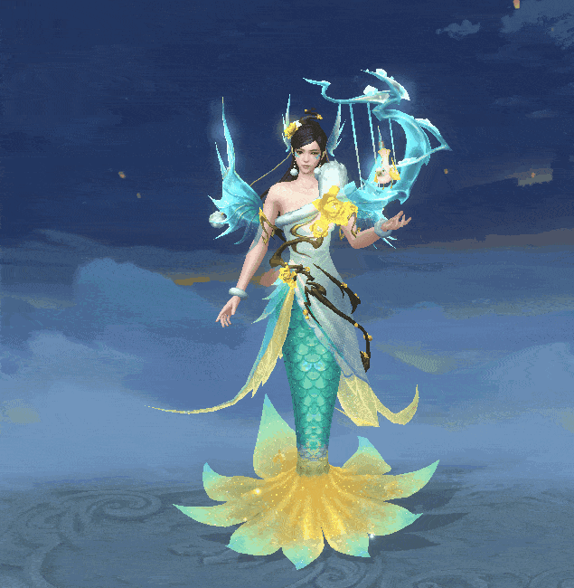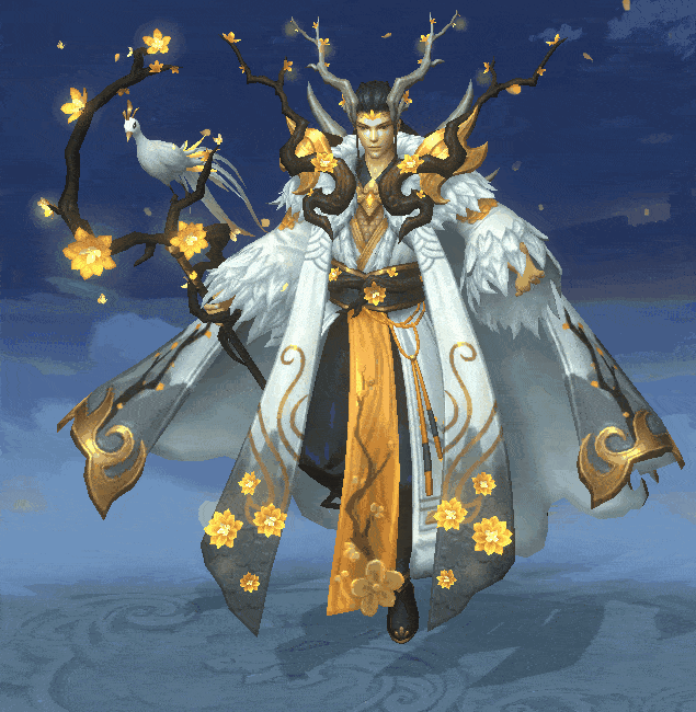 沿用了胸前龙头特征以及大披风的服装样式,以黄、白色的腊梅作为装饰,通过梅花赋予应龙作为魔神超凡脱俗的仙人境界,与左月爱情的唯美寓意。刻画一位谪仙般的美男子,浑身仿佛都散发着冷冽的腊梅幽香,清冷、高贵。