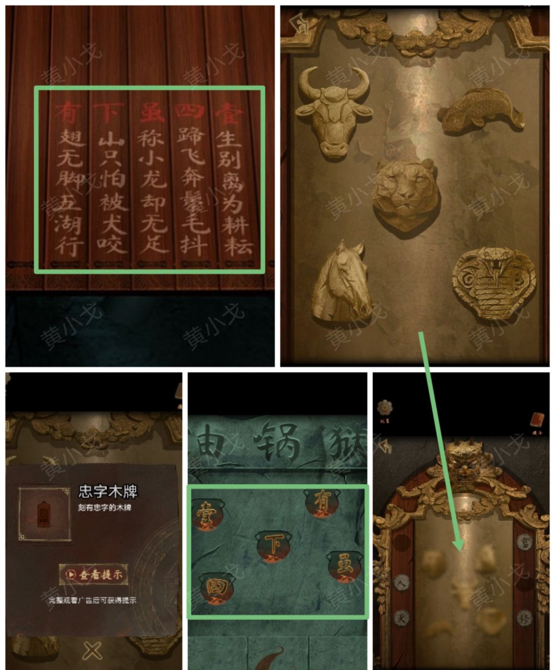 11.点击镜面,根据油锅狱石墙上的线索(字的位置:左上-壹、左下-四、中-下、右上-有、右下-虽)和竹简上的线索(壹-耕耘、四-鬃毛、虽-无足、下-怕被犬咬、有-有翅无脚),调整兽首的位置(左上:牛🐮、左下:马🐴、中:豹子🐆、右上:鱼🐟、右下:蛇🐍)。获得【忠字木牌】