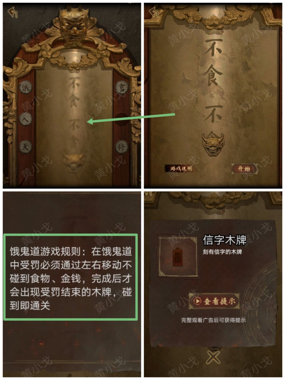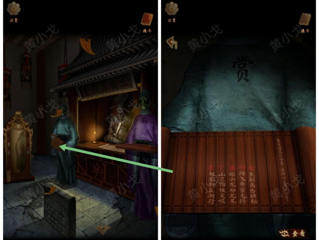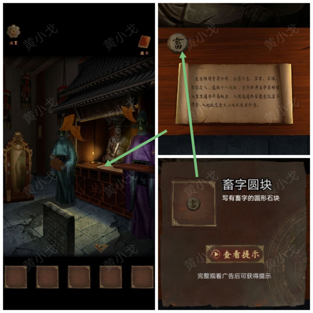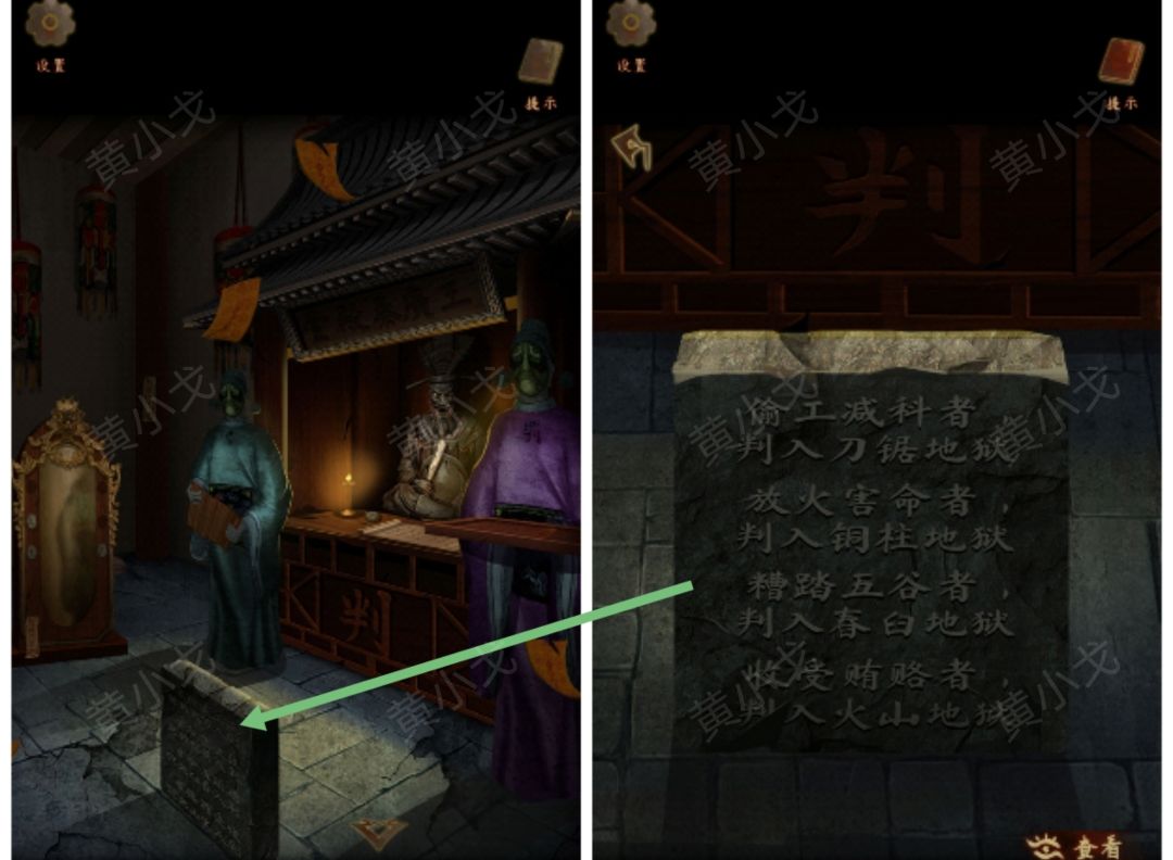 7.(殿内)点击石碑,获得线索(偷工减料者-入刀钜地狱、放火害命者-入铜柱地狱、糟蹋五谷者-入春臼地狱、收受贿赂者-入火山地狱)