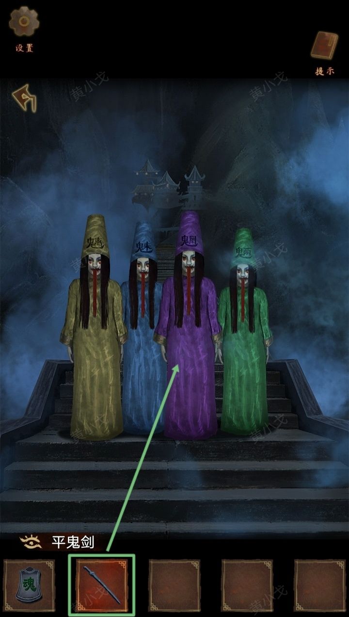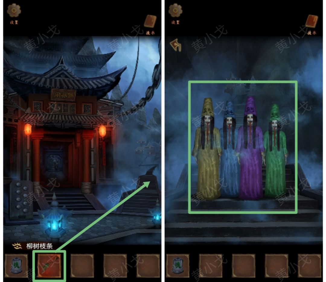 27.(供养阁外)对另一侧的路使用【柳树枝条】,小鬼显现(注意看小鬼的帽子颜色及上面的字:黄-魑、蓝-魅、紫-魍、绿-魉)