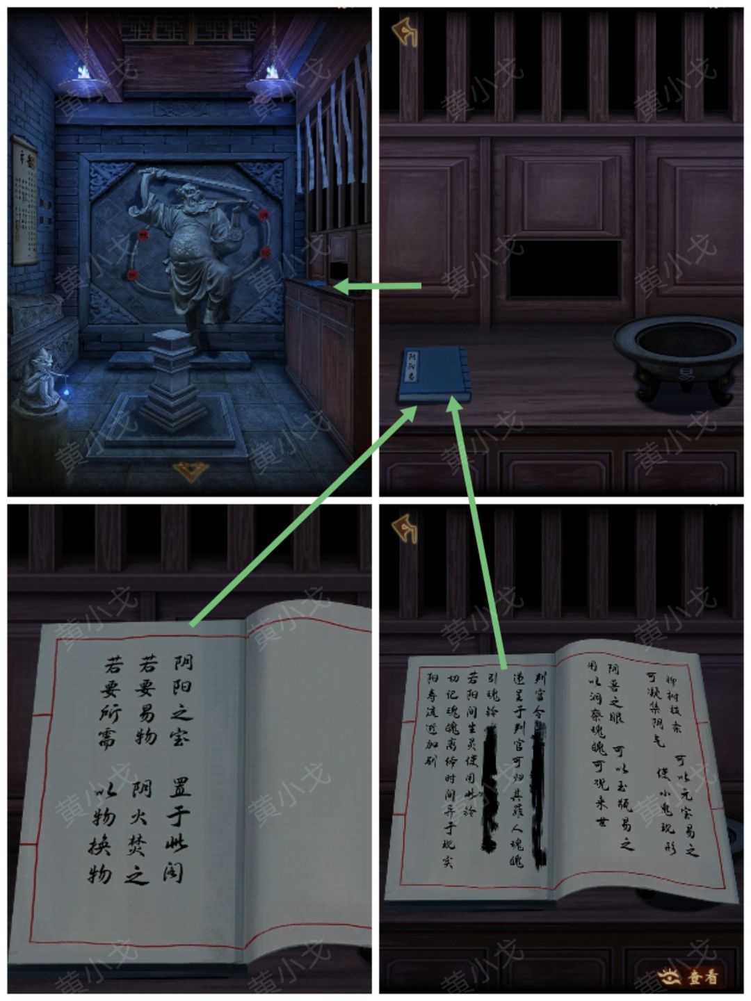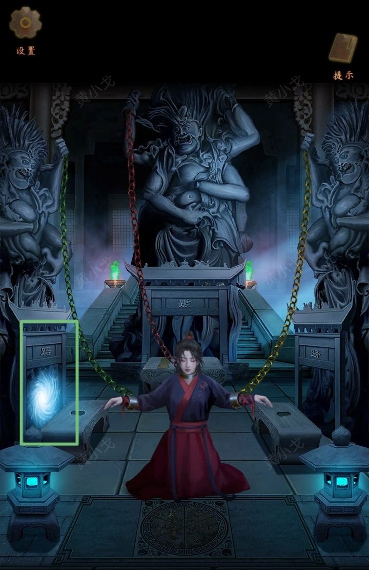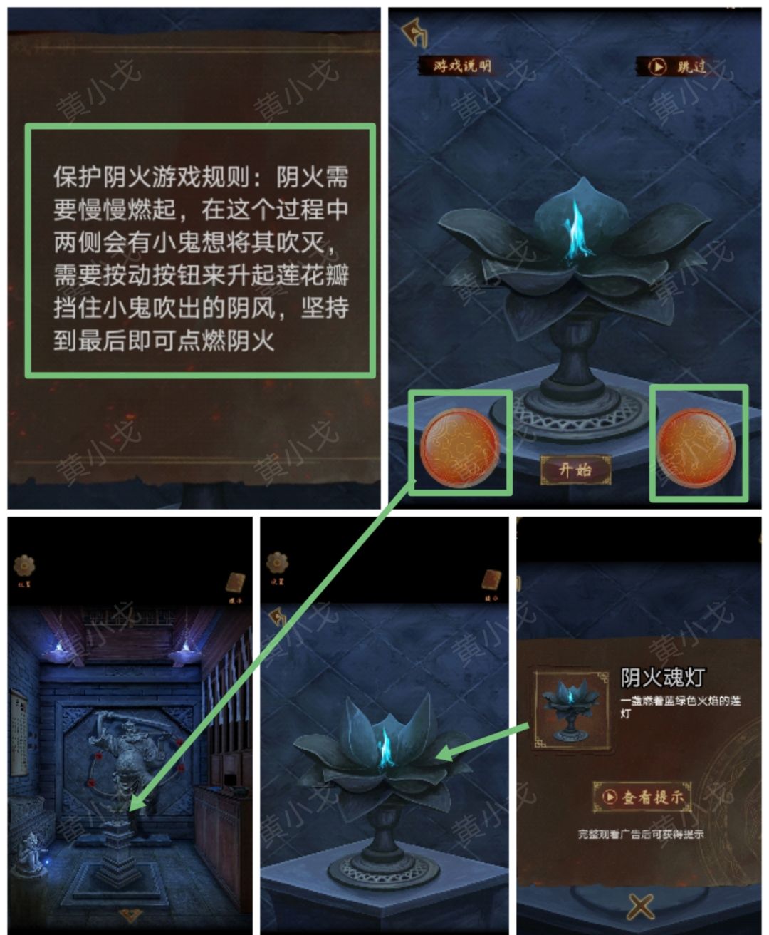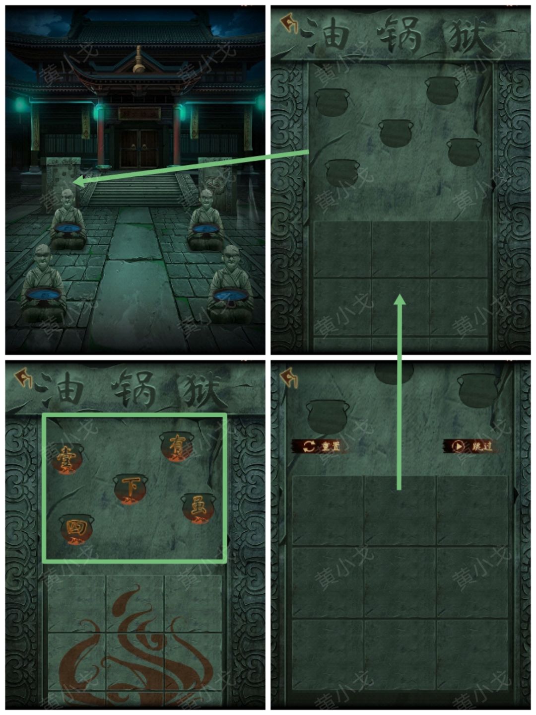 3.(殿外)点击油锅狱石墙,完成点亮石块小游戏,殿前左边的鬼火燃起(注意看字的位置)