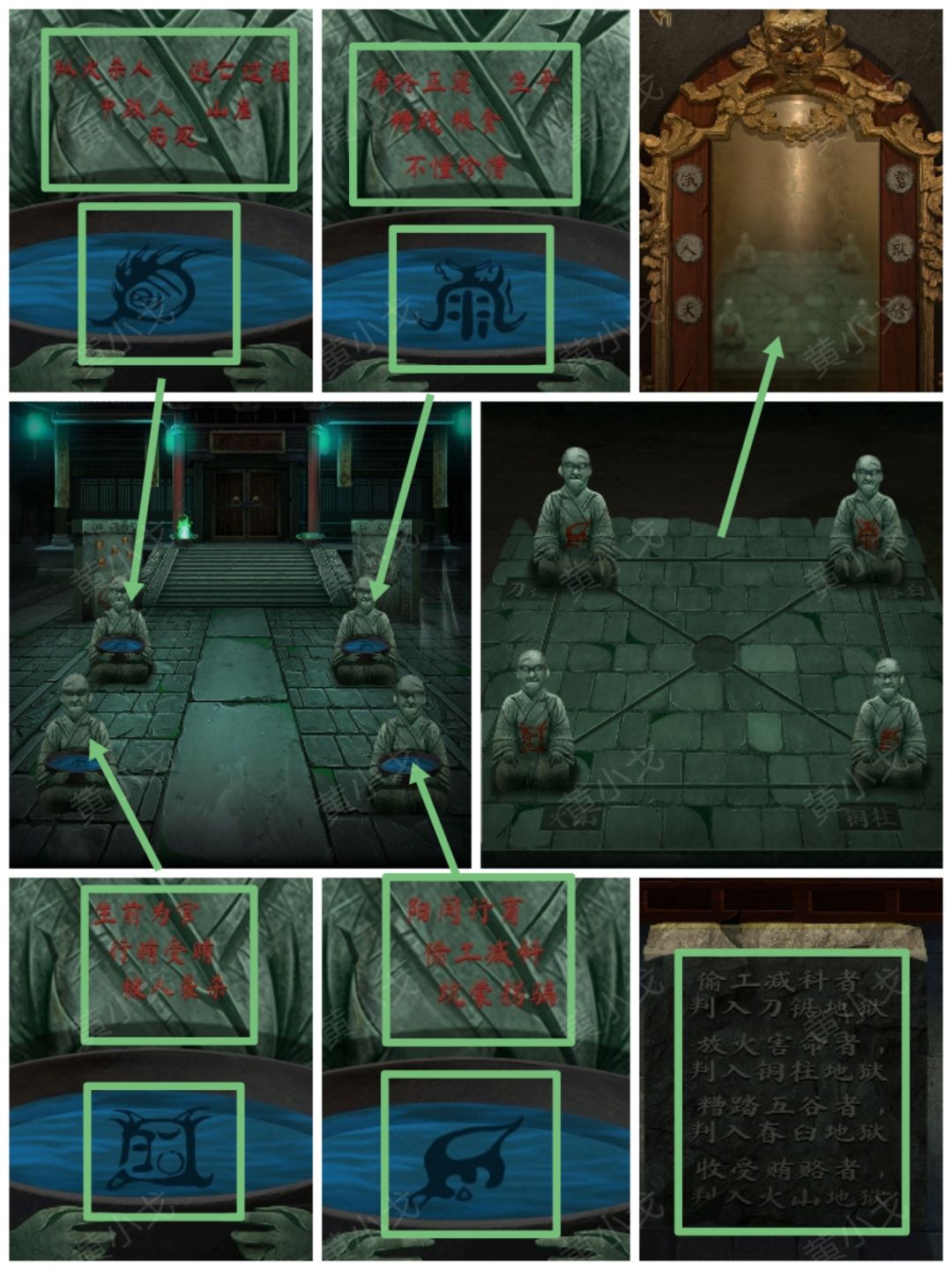 17.点击镜面,根据殿前四个石像上的字和图案,结合石碑上的线索(偷工减料者-入刀钜地狱、放火害命者-入铜柱地狱、糟蹋五谷者-入春臼地狱、收受贿赂者-入火山地狱),调整石像的位置