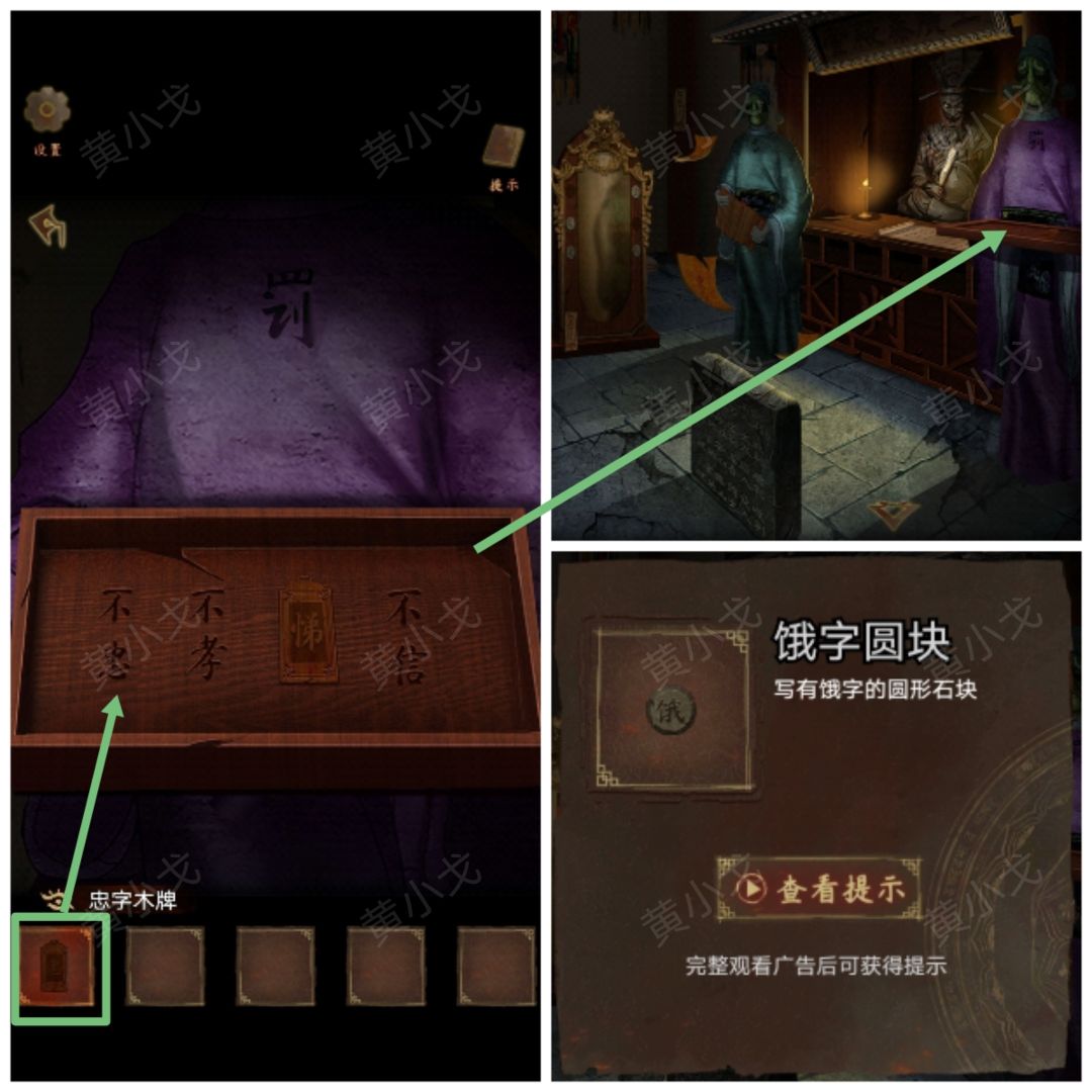12.点击右边的阴司,放上【忠字木牌】,在左边阴司的手中获得【饿字圆块】