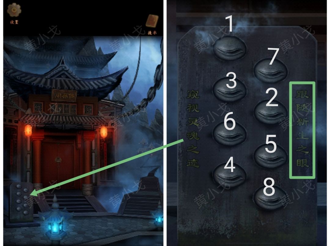 21.(供养阁外)点击石墙,根据石墙上的提示(跟随新生之眼),按顺序点击眼睛(每次都会睁开一只眼,点击新的睁开的眼睛)