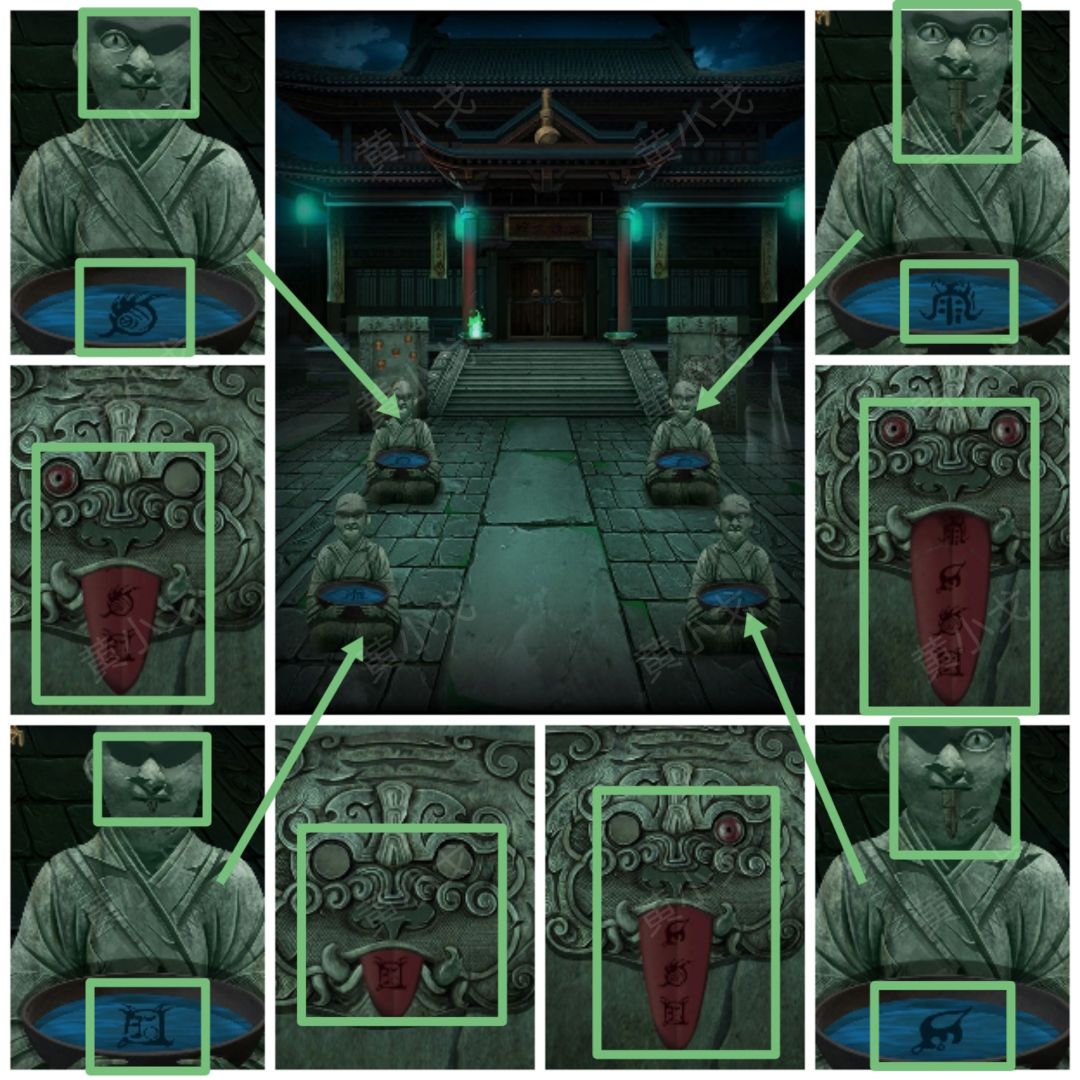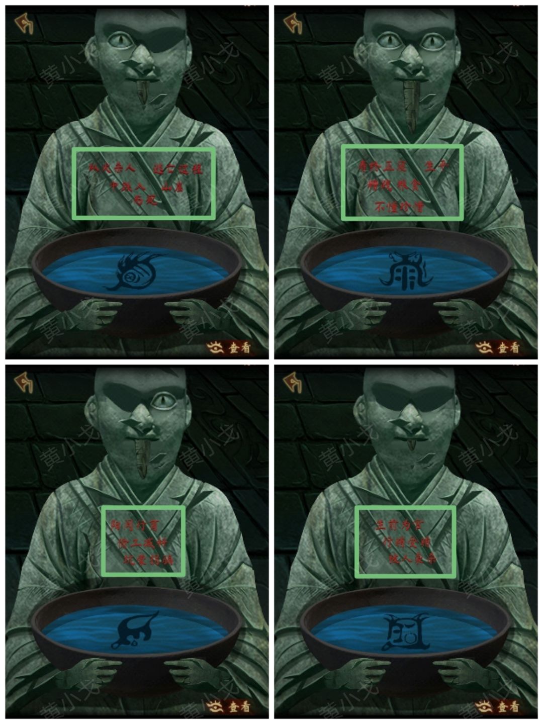 5.点击四个石像,根据他们的眼睛状态,结合拔舌狱石墙上的线索,调整他们的舌头长度和盆里的图案