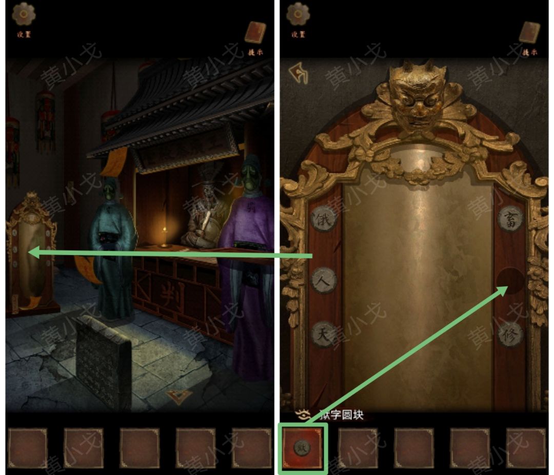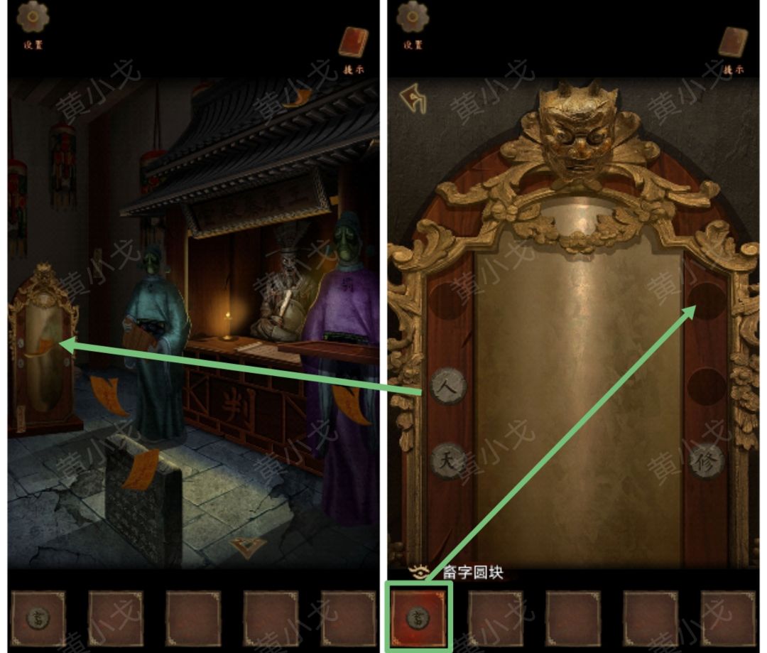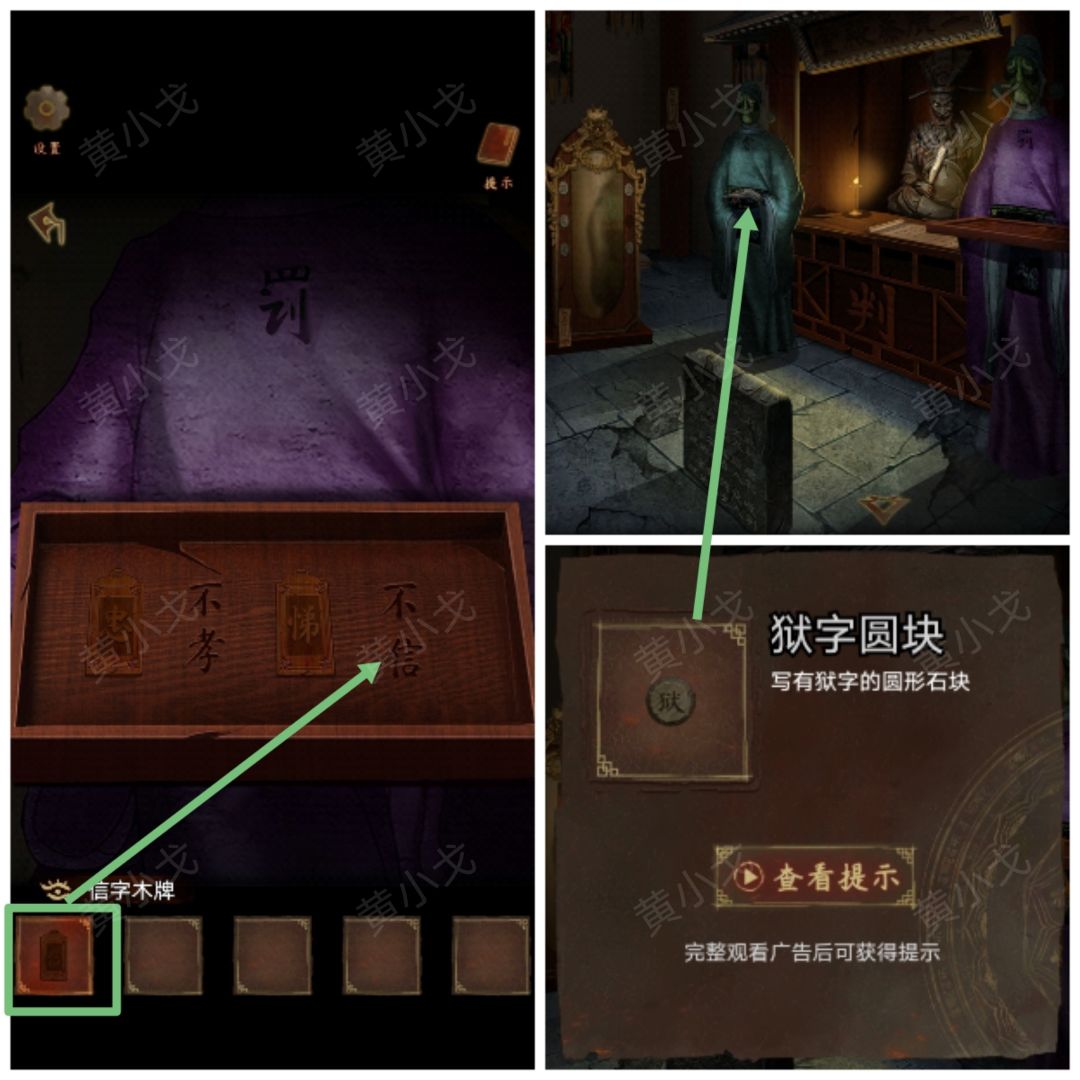 15.点击右边的阴司,放上【信字木牌】。在左边的阴司手中获得【狱字圆块】