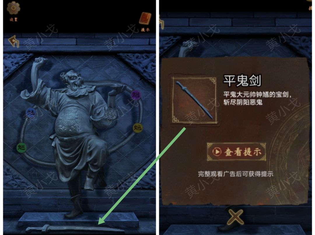 28.(供养阁)点击钟馗塑像,根据小鬼帽子上的线索,调整字石块的颜色(黄-魑、蓝-魅、紫-魍、绿-魉)