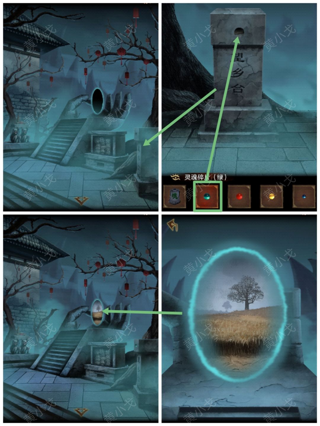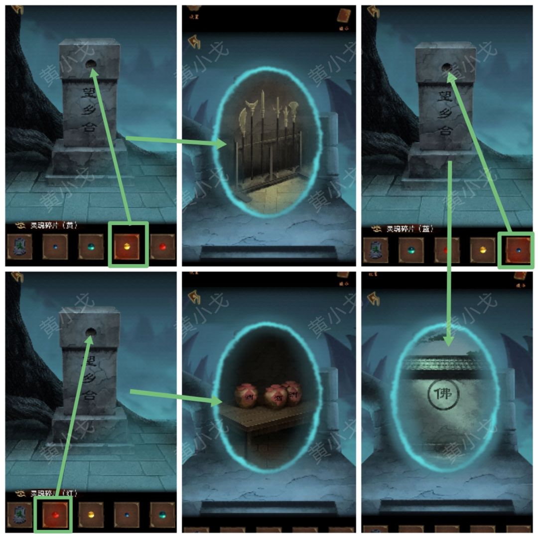 7.点击望乡台台子,分别放入四颗【灵魂碎片】,然后看对应的显示屏上的景象(黄-兵器、蓝-佛、绿-稻田、红-酒)