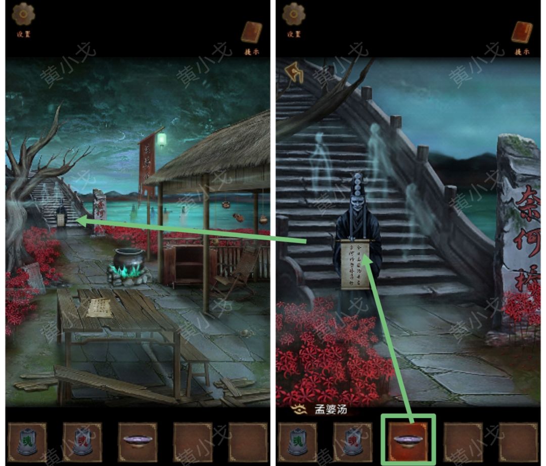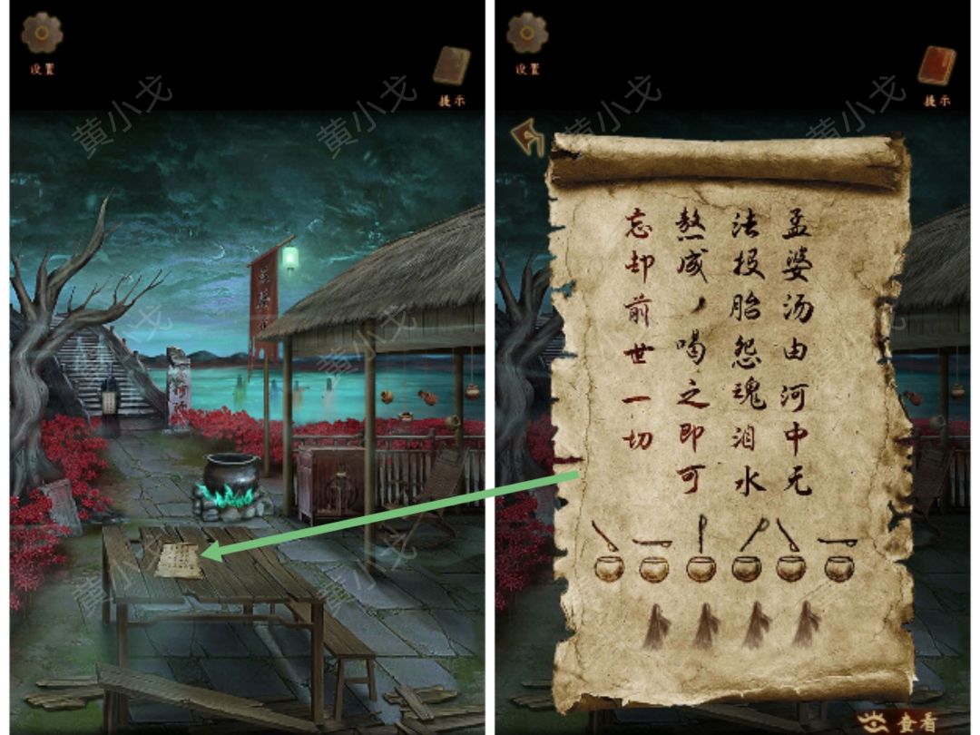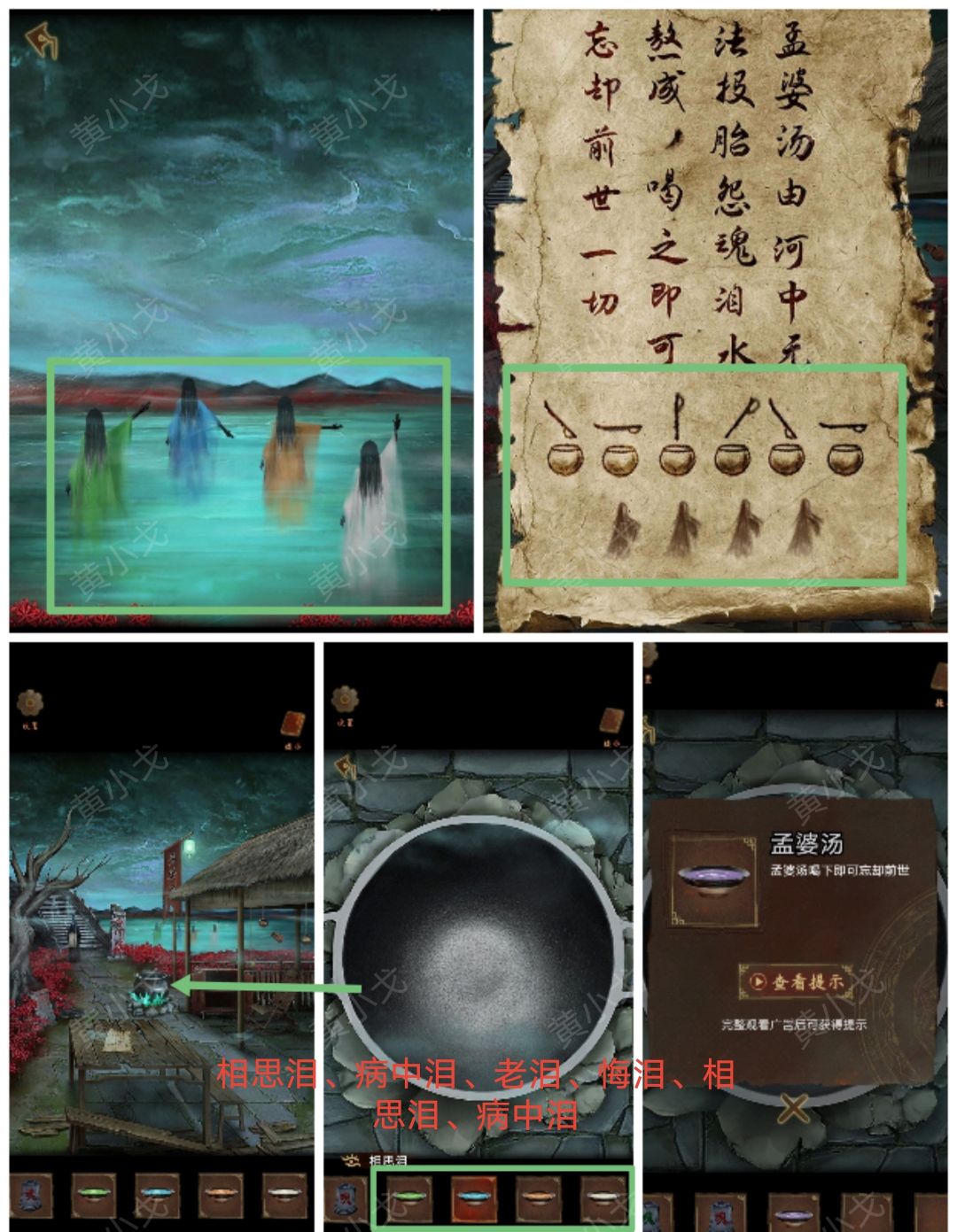 26.点击锅,根据卷轴上的线索(下右上斜上下右)和女鬼衣服的颜色及手势(绿-斜上、蓝-下、黄-右、白-上),结合四种泪的颜色(相思泪-蓝、病中泪-黄、老泪-白、悔泪-绿),按顺序倒入四种泪(相思泪、病中泪、老泪、悔泪、相思泪、病中泪),获得【孟婆汤】