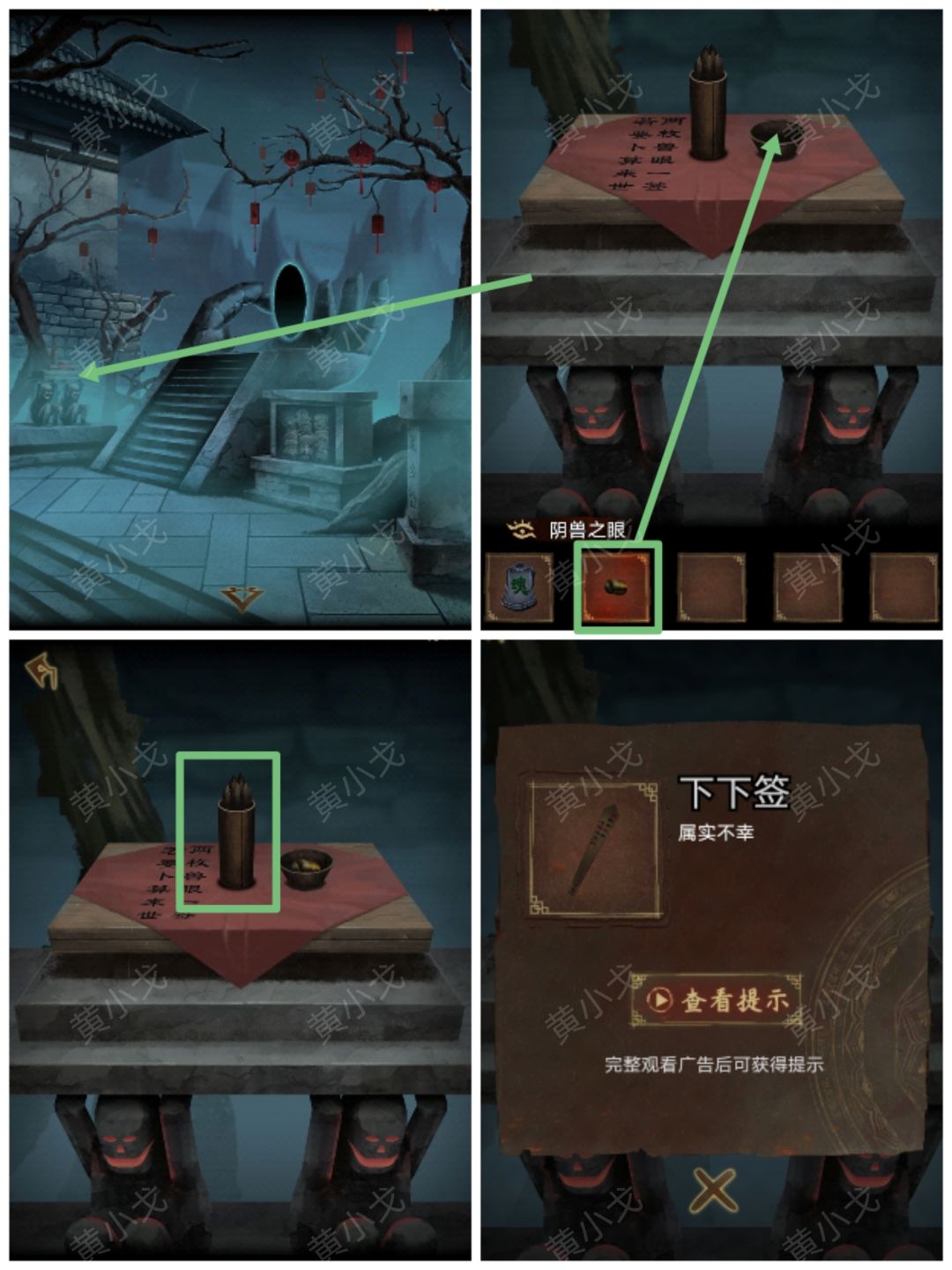 4.(望乡台)点击算卦台,把【阴兽之眼】放入碗中,点击签筒算卦,获得【下下签】