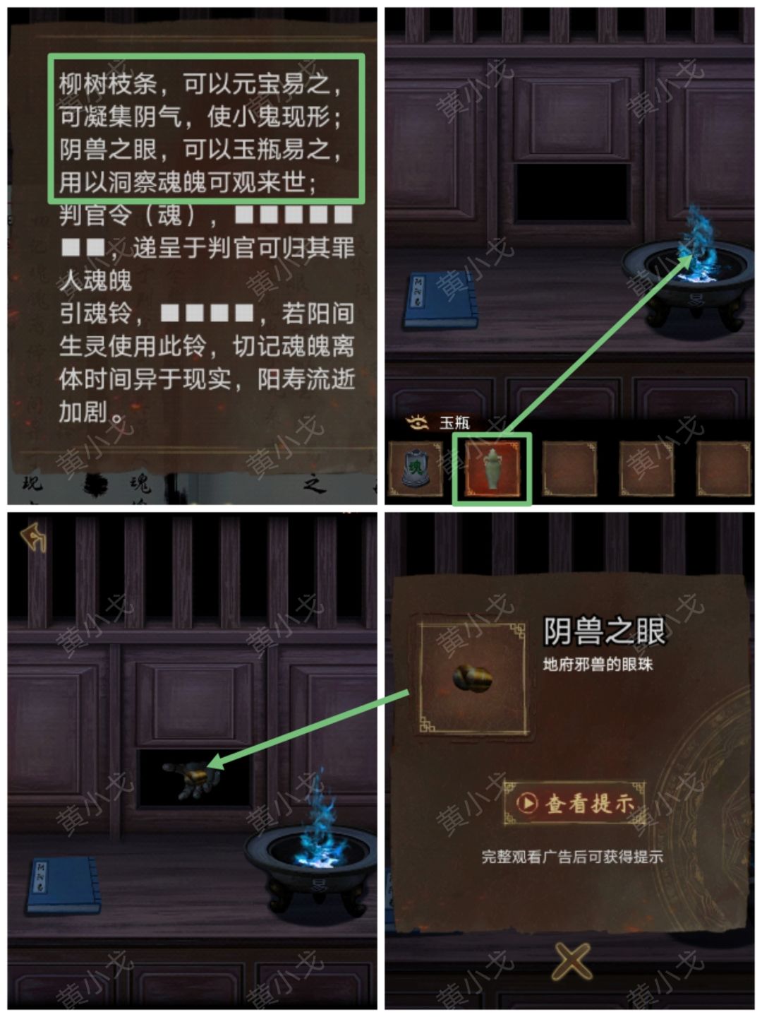 3.(供养阁)点击柜台,把【玉瓶】放入盆中,获得【阴兽之眼】(此步骤依据《阴阳易》)