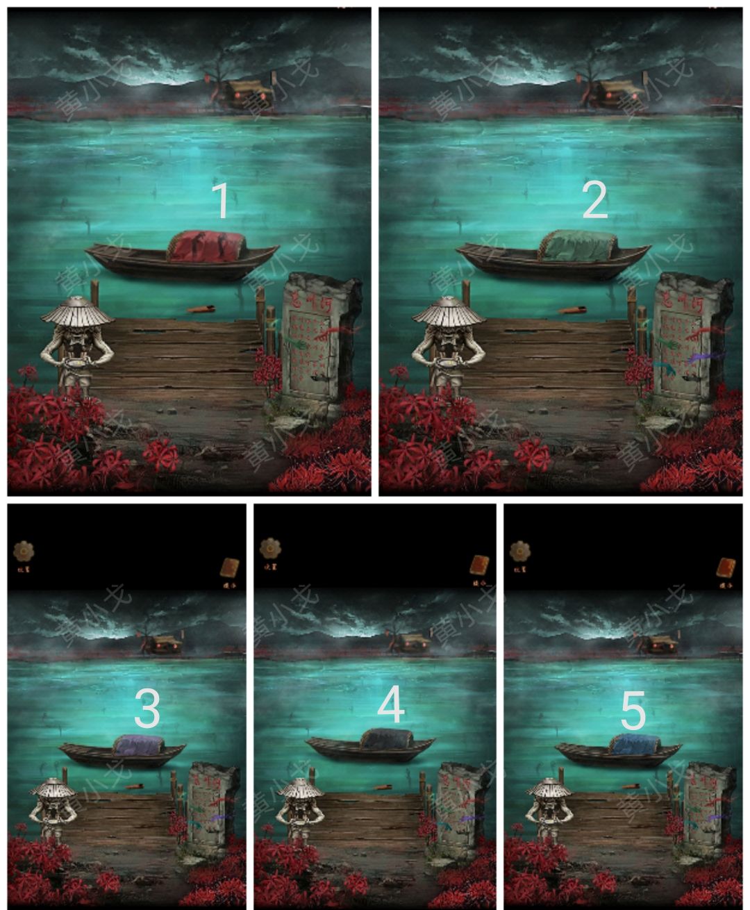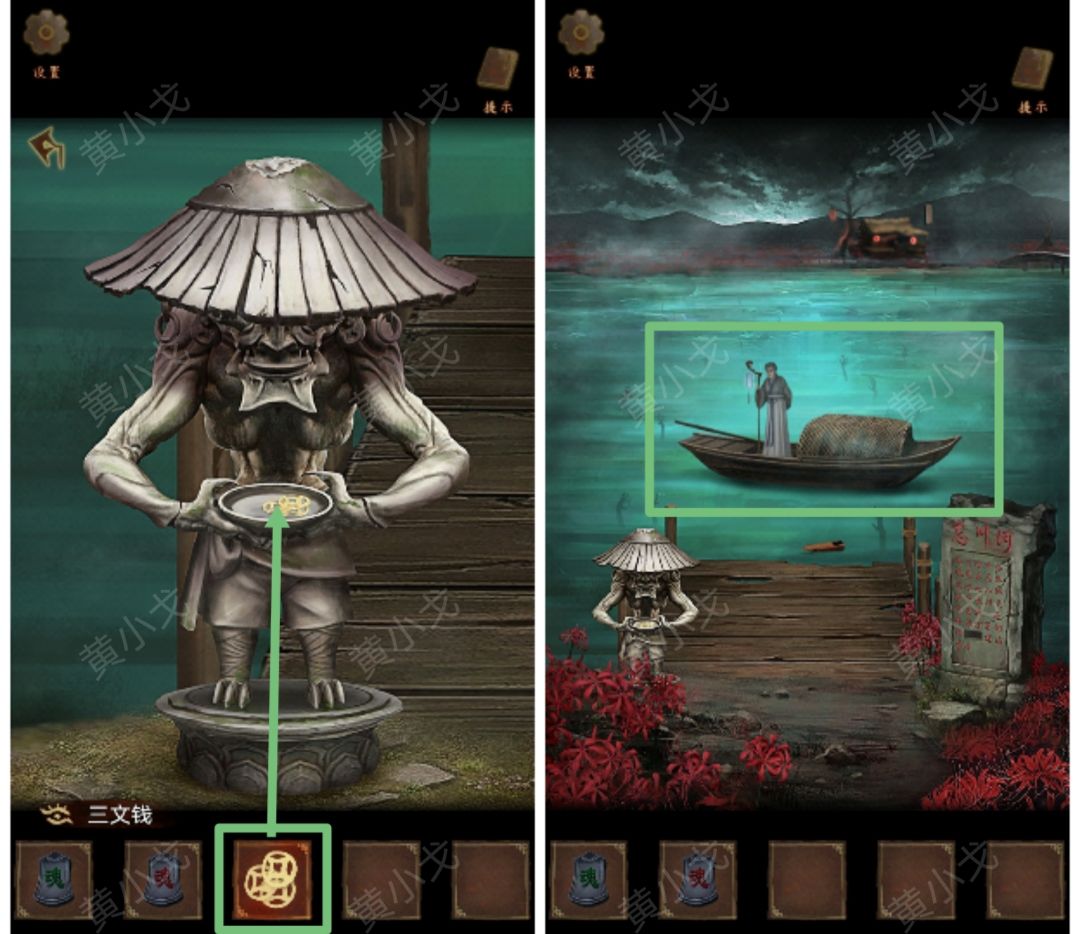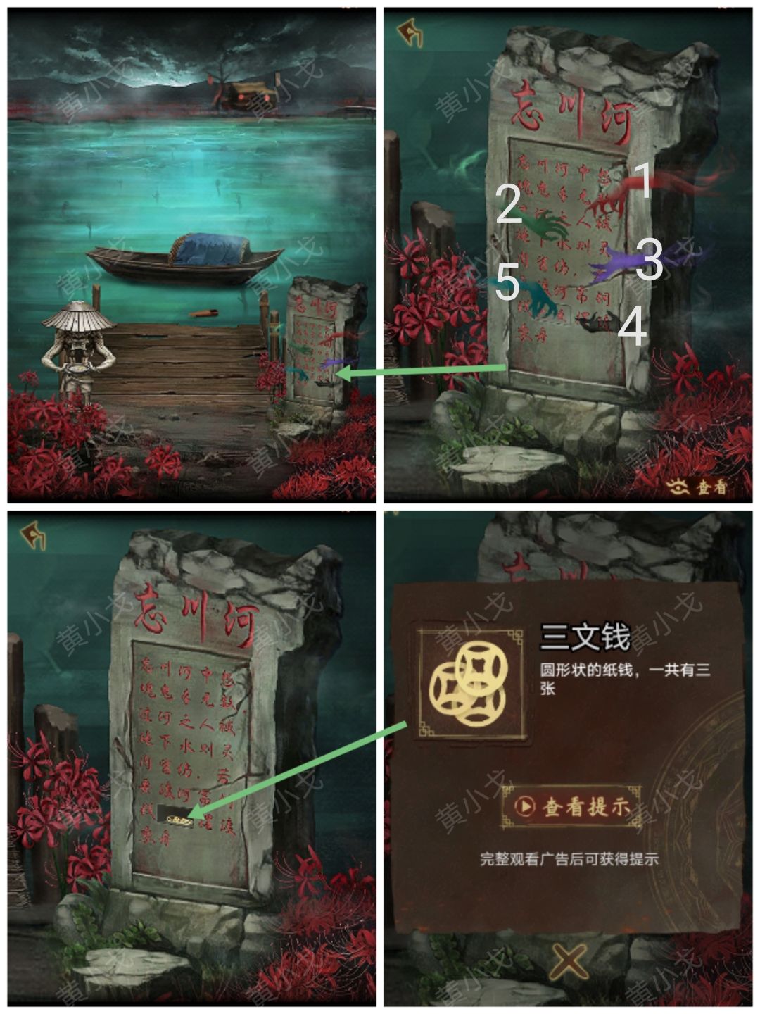 17.点击忘川河石碑,根据船的颜色和顺序,按(红绿紫黑蓝)的顺序点击鬼手。暗格打开,获得【三文钱】