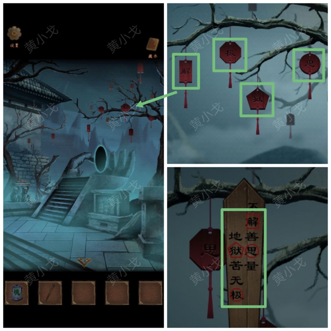 5.点击右边树上的牌子,根据牌子的形状,结合【下下签】上的线索(正方形-解、圆形-思、五边形-狱、六边形-极),调整对应的字