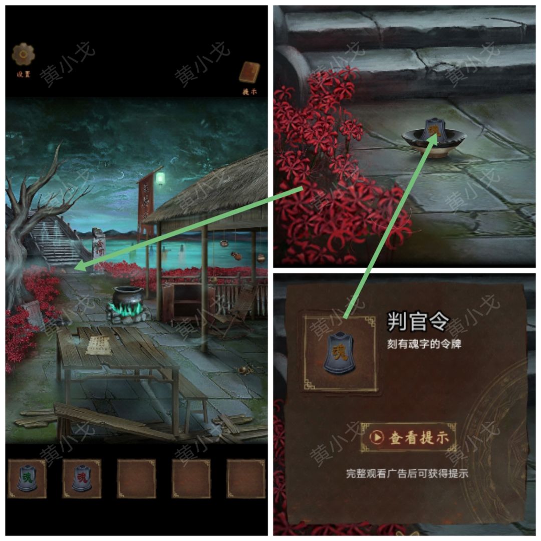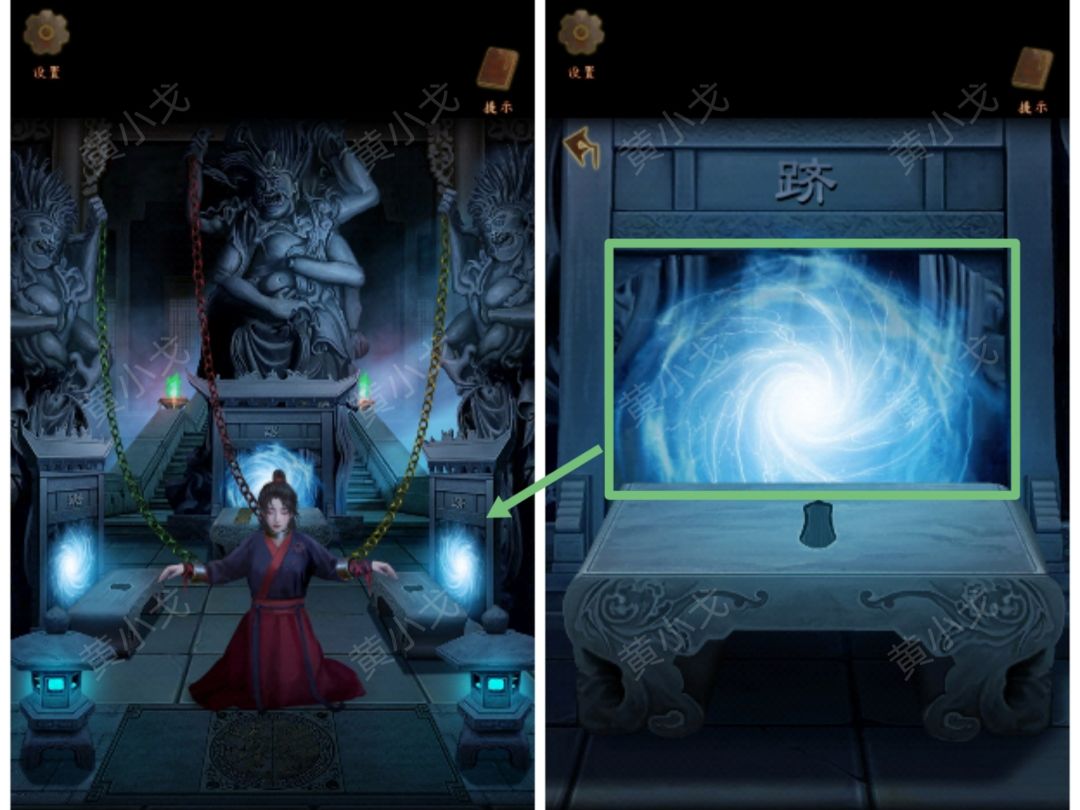 29.(地府)根据锁魂链的颜色,把对应颜色的【判断令】放入传送门前面桌子上的凹槽处(踞-绿、踬-红、跻-黄),救出柳瑶
