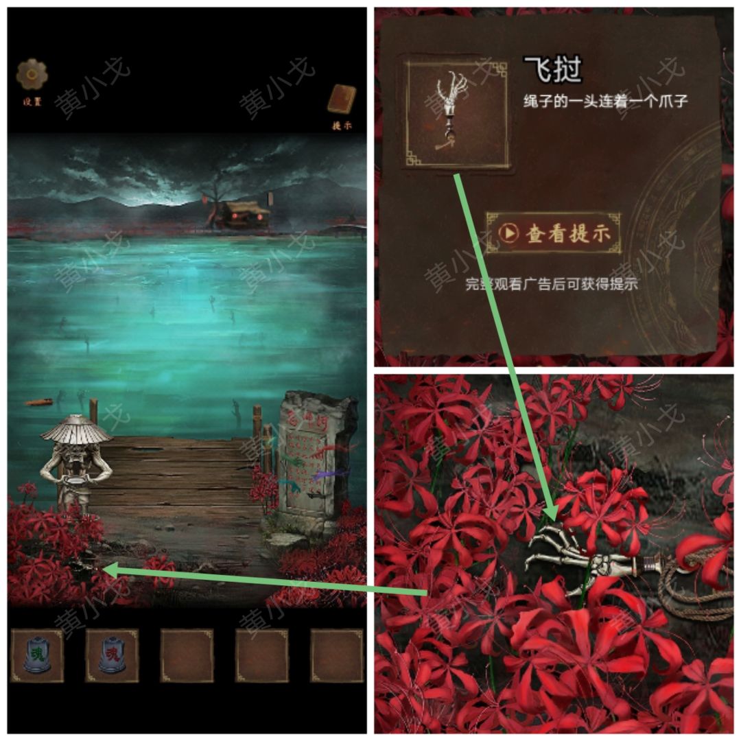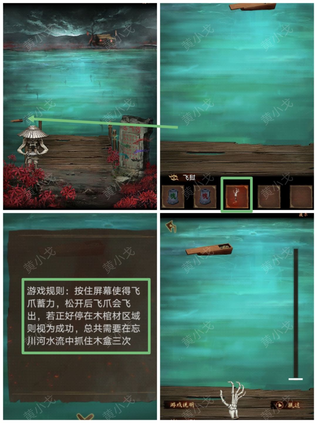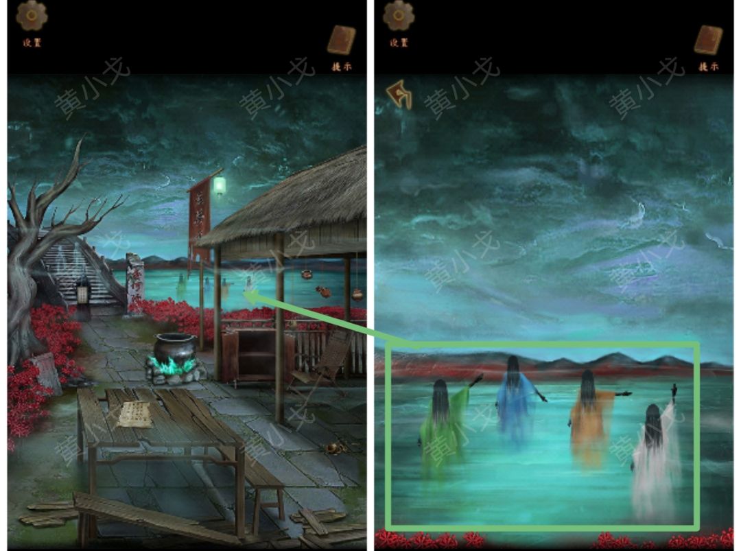 25.点击查看忘川河中的女鬼(注意看女鬼的衣服颜色和手势:绿-斜上、蓝-下、黄-右、白-上)
