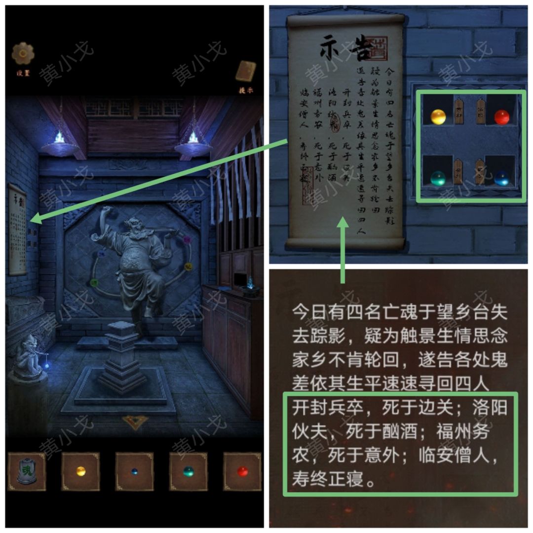 8.(供养阁)点击查看墙上的告示(开封兵卒、洛阳-酗酒、福州-务农、临安僧人)。根据告示上的线索及望乡台上的线索,把四颗【灵魂碎片】放入对应地点的格子中(开封-黄、洛阳-红、福州-绿、临安-蓝)