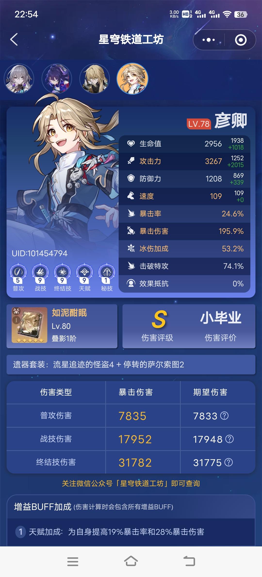我彦卿一直带的四怪盗二萨尔索图,怪盗是因为爆伤好毕业,不想做遗器的牢,全部拿来刷光锥和天赋材料了。