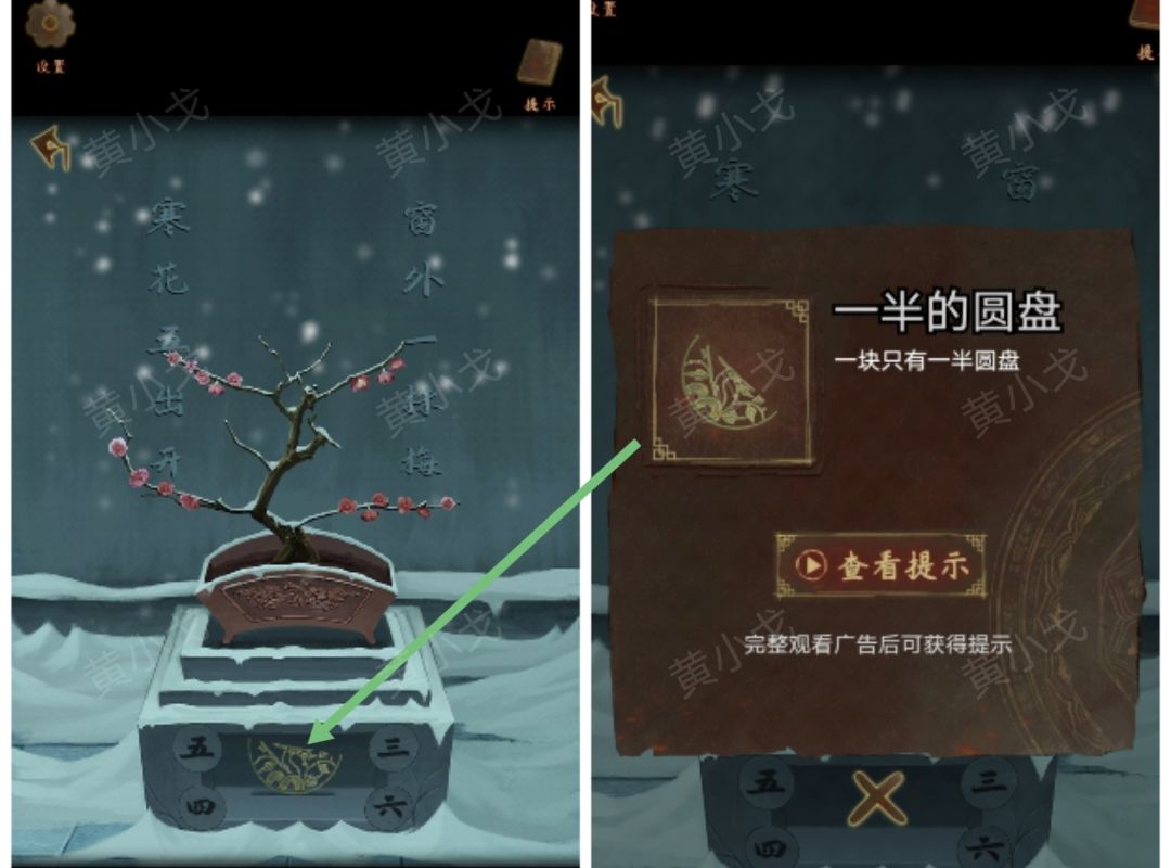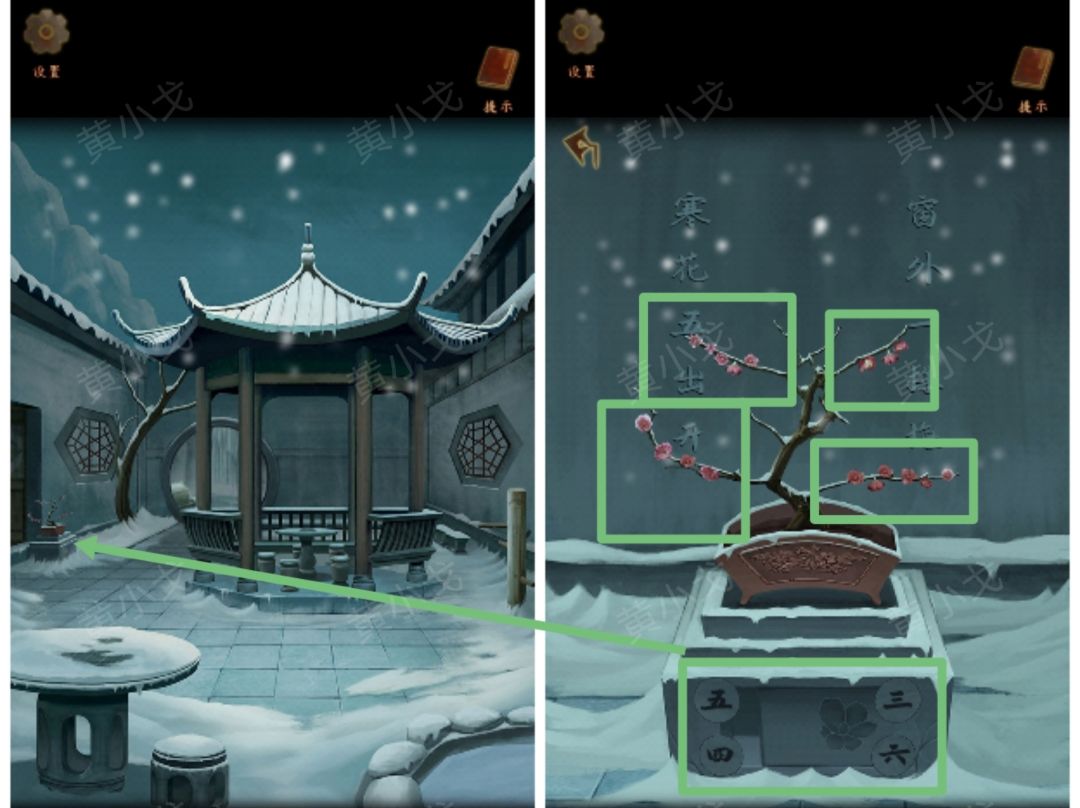 21.(白兰宗-庭院-雪)点击花盆,根据梅花的数量,调整密码(五四三六)