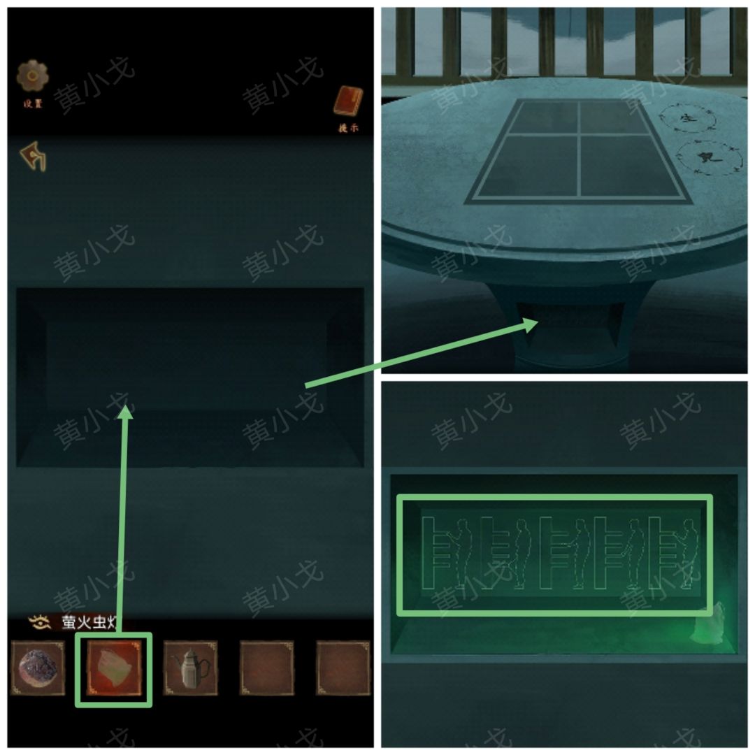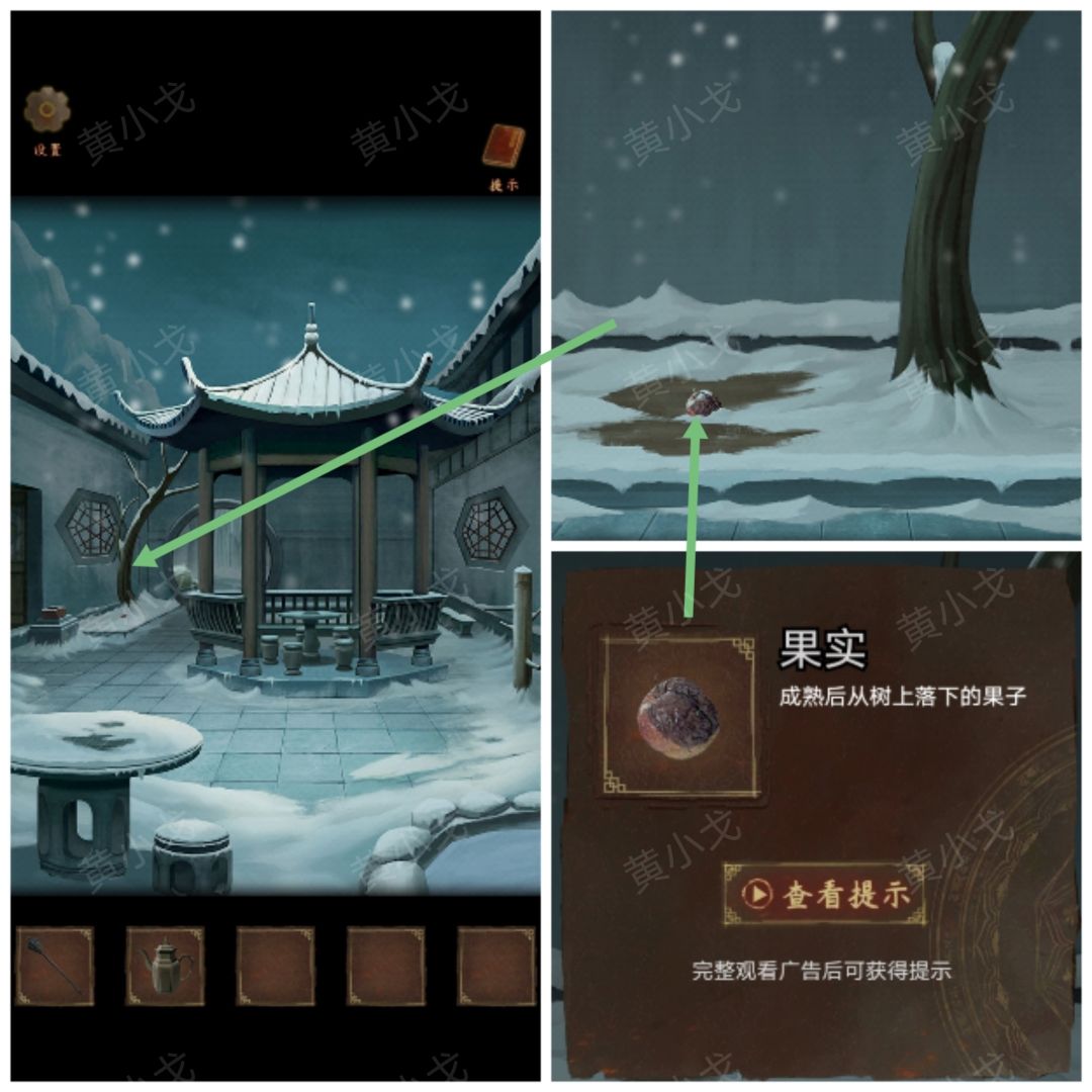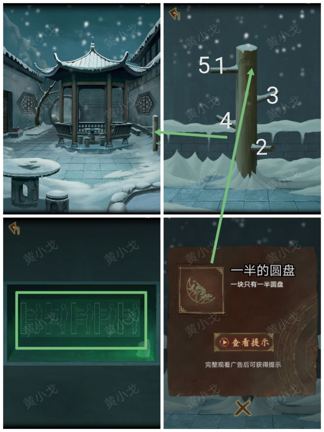14.(白兰宗-庭院-雪)点击亭子石桌上的暗格,放入【萤火虫灯】,获得线索(打木桩:一四二三一)