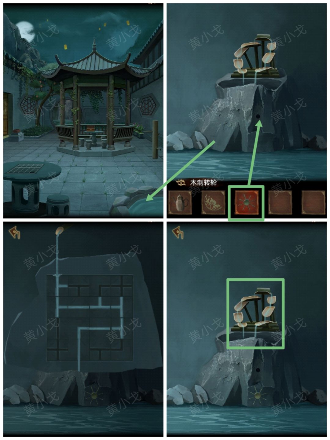 18.(白兰宗-庭院-太阳)点击池子,放上【木制转轮】,点击水车,完成接水管小游戏