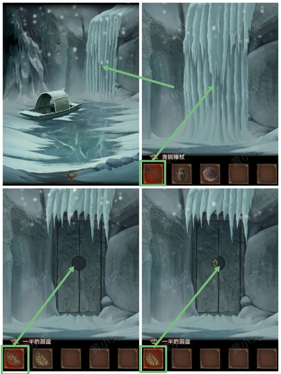 23.点击瀑布,用【青铜锤杖】砸开冰帘,放入两块【一半的圆盘】。打开石门