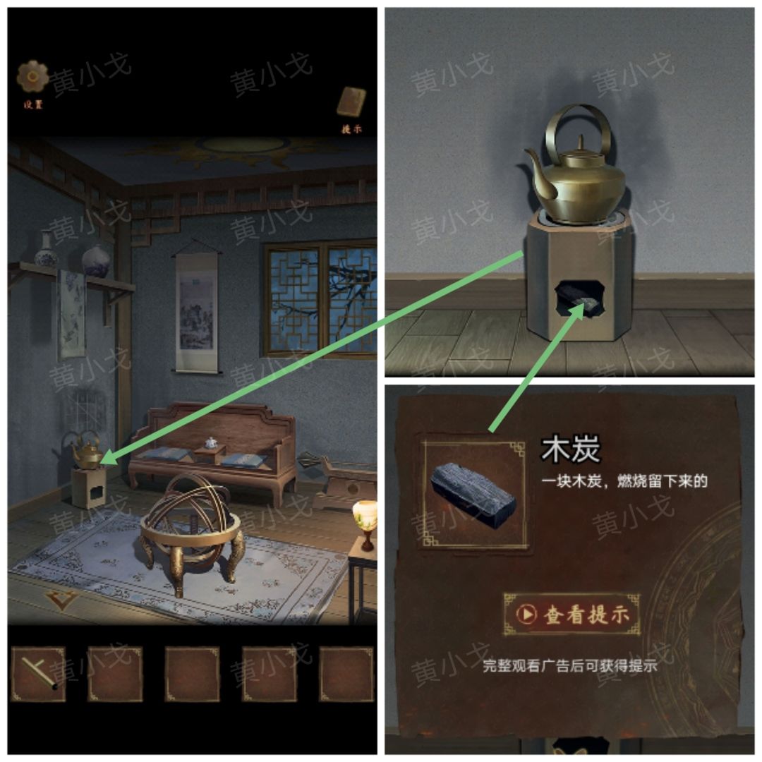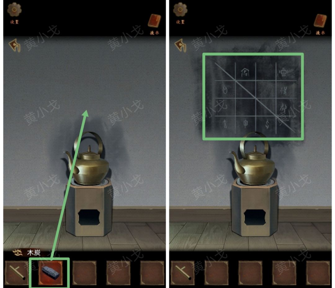 2.用【木炭】描火炉上面的墙面,获得线索
