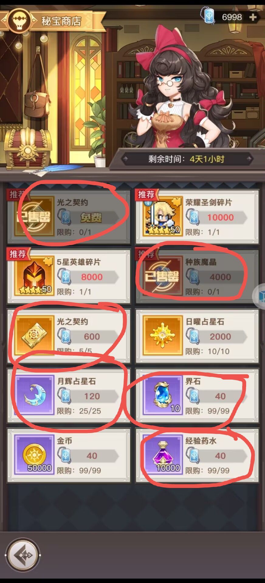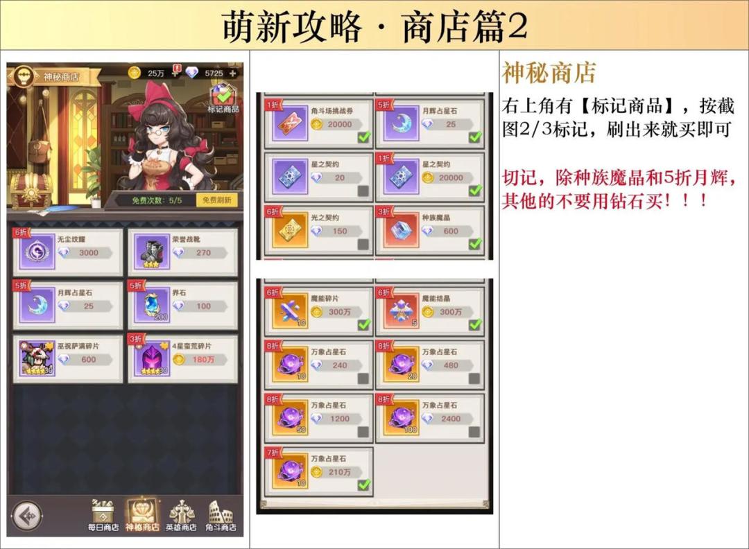 16.关于商店买什么,换什么的问题。先不说以后得商店,就目前这些商店来说,第一个钻石商店每天买免费和1折的,前期可以买一买四折的界石,以及五折的种族魔晶和五折的万象占星石。第二个商店神秘商店,每天买七折以内的全部金币道具,当然咯,前期不买金币狗粮什么的,金币急缺不够用。第三个英雄商店可以换英雄或者魅魔。第四个公会啥也不换,帮贡全部用来点技能。第五
