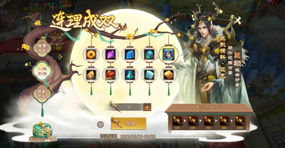 连理可得应龙封灵玉*疏影横斜。梅树上面一共有十份奖励,连理依次需要消耗连理枝1/2/3/4/5/6/7/8/9/10个。