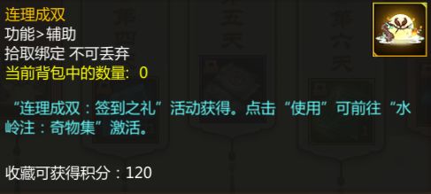 第三日签到可得连理成双激活道具,连理成双可前往“水岭注:奇物集”激活。