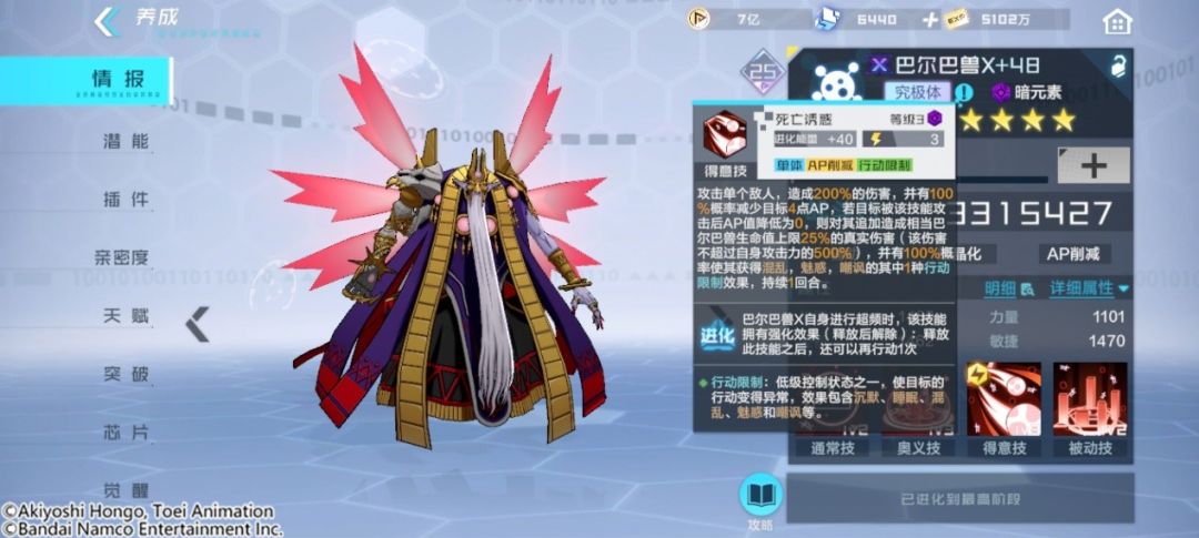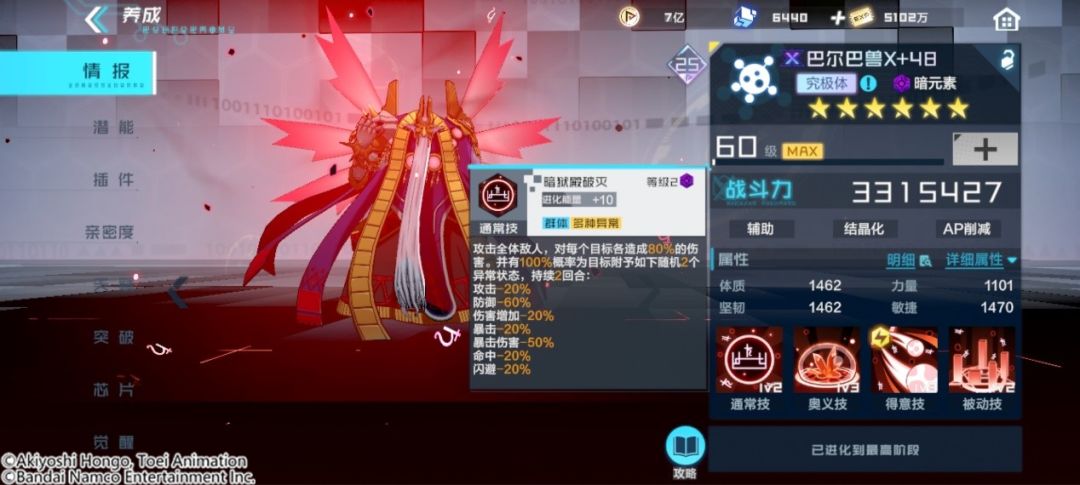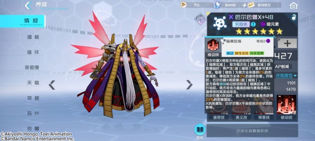 第二种玩法:全队只有它一只暗属性的巴尔巴兽X,能够使用通常技实现给目标上多次多层异常的效果,能够对一波流阵容的输出有一定的克制。同时,每次攻击能够触发巨人核心效果,打出一定的输出。
