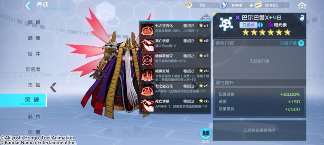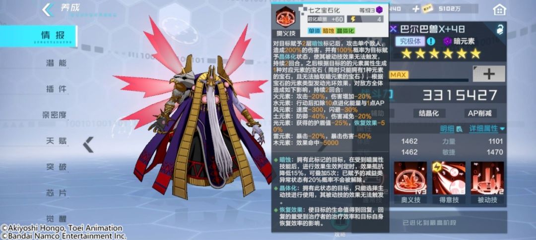 被动技:免伤减伤光环、协同攻击、暗属性增伤。其中敌方有暗蚀标记的目标行动后,能使我方攻击最高的暗属性数码宝贝使用通常技攻击,这个效果完美解决了秩序兽启动慢的问题。
