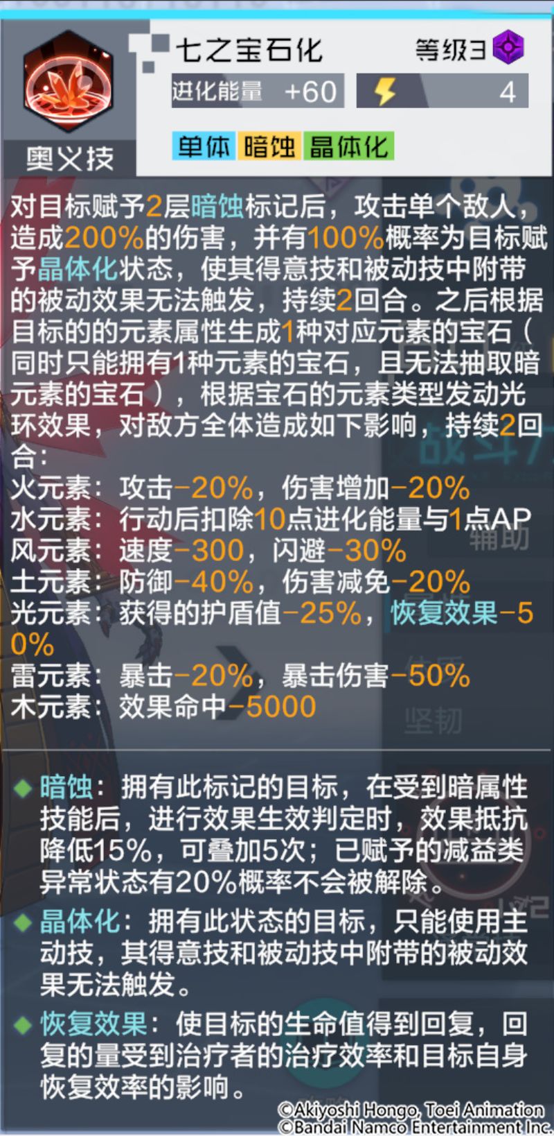 奥义技会对目标赋予多层暗蚀标记后,攻击单个敌人造成伤害,并有概率为目标赋予晶体化状态,使其无法发动被动效果。之后根据目标的的元素属性生成一种对应元素的宝石(同时只能拥有1种元素的宝石,且无法抽取暗元素的宝石),根据宝石的元素类型对敌方全体造成如下影响:
