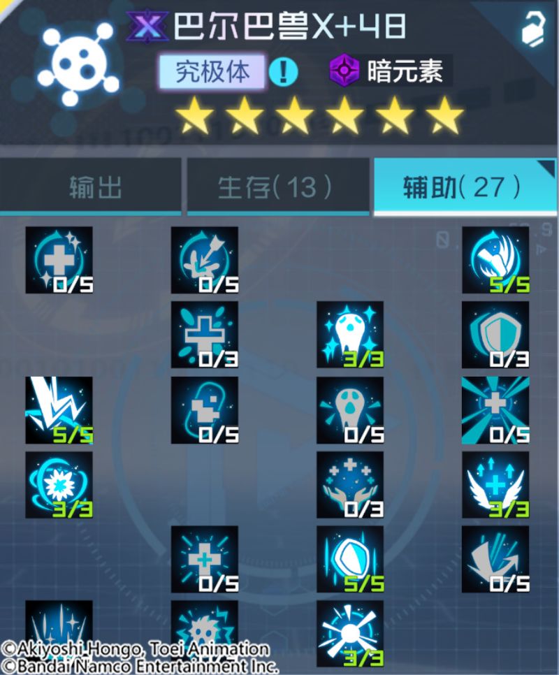 被动技的效果是巴尔巴兽X将敌方所处的空间污染,使其化为【暗黑区域】,敌方每次在【暗黑区域】获取增益时,将产生1层【暗焰】(有层数上限)。开场时,巴尔巴兽X将获得1层【暗焰】,每层【暗焰】为我方全体提供伤害减免,降低敌方最终伤害。敌方具有暗蚀标记的目标在【暗黑区域】中行动后,我方攻击力最高的暗元素角色将以通常技对其发动攻击。当巴尔巴兽X在场时,提升我方全体暗元素角色的伤害增加。此外,巴尔巴兽X不会受到麻痹状态的影响。这样一位数码宝贝,适合作为团队中的“DEBUFF制造机”去限制削弱敌方,并为己方提供一定辅助增幅效果。