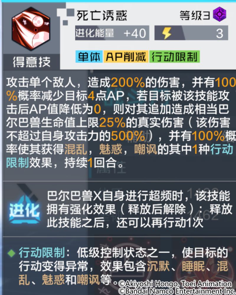 技能解析:攻击敌方单体并扣除其数点AP,若目标的AP值被扣为0,还会额外承受相当于巴尔巴兽X最大生命一定比例的真实伤害,同时被赋予随机1种行动限制状态。