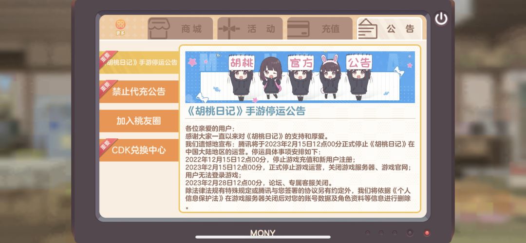 近几年,游戏行业的寒冬到来,行业中的小公司和小团队纷纷顶不住压力破产解散,就连大公司们也纷纷裁员,全都不约而同的开始讲究起“降本增效”,勒紧裤腰带抵抗这个冬天。 流水、KPI、停运、裁员、毕业、调岗、活水、劝退、N+1、仲裁……这些词汇开始高频度地出现在了每一个从业者的日常生活中。 而胡桃项目组所面对的,无外乎也是同样的困境。营收压力导致游戏在设计思路上产生了一系列的扭曲变形,也使这个游戏似乎不再那么单纯有爱了,变得不再是我作为制作人在立项之初所设想的那个样子了。 胡桃日记并不是一个强盈利性质的产品,七濑胡桃的自媒体频道也是难以产生盈利的为爱发电行为,所以在逐利的资本面前,小胡桃最终也没能顺利挺过这个冬天。