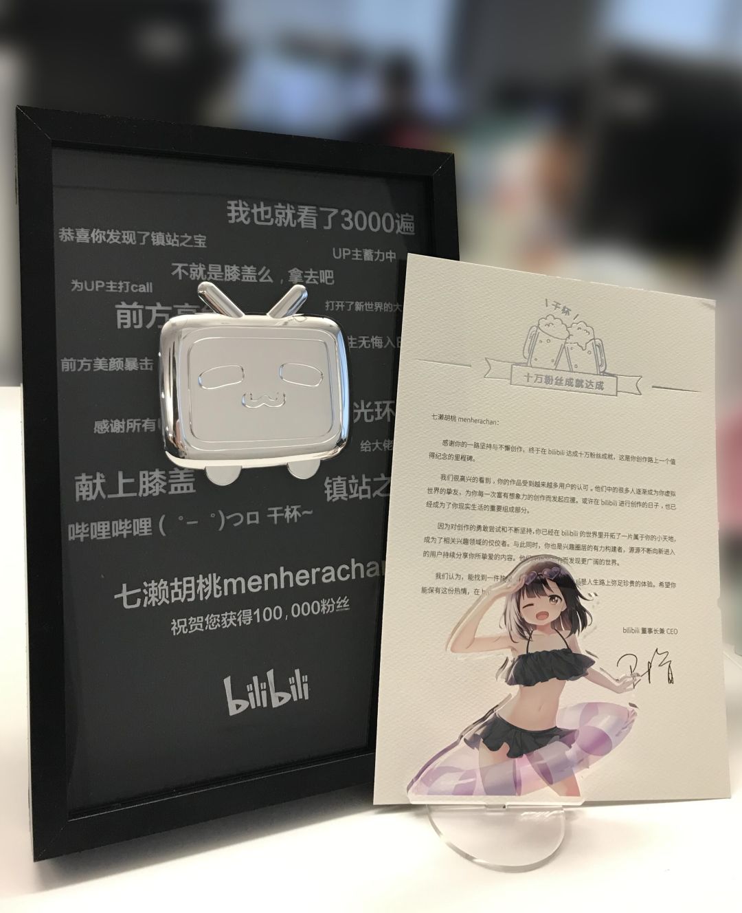 2019年7月19日,我们收到了七濑胡桃B站10w粉的奖牌,我们在工作室布置了一个区域,把奖牌摆在了C位,还装饰了许多胡桃的周边。 同时,也是从这时候开始,我们渐渐有实感地感受到,有多少人和我们一样喜爱着这个可爱的女孩。