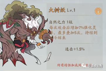 1级大树妖每次攻击增加7%的强化灵兽,5次就是35%,相当于一半的灵兽满级的紫色的强化灵兽,等级越高可想而知的厉害,对于玩灵兽的玩家必带的精怪;