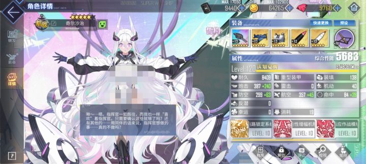 六期第一位肝的舰娘,不说强度方面,白毛机娘大姐姐,XP直接点满,原本我以为五期的布雷斯特穿得够少,但,这位更是重量级,立绘个人还是很喜欢的,就是手臂的造型不太自然,即使是现在有了动态立绘,感觉还是一言难尽的样子,还有背后连接的能量管道,PV画面是传输能量的一种展示形式,然,也没有很好的还原,无所谓,年底皮肤爷给你买,为赛博波奇酱献出红尖尖!😐👍