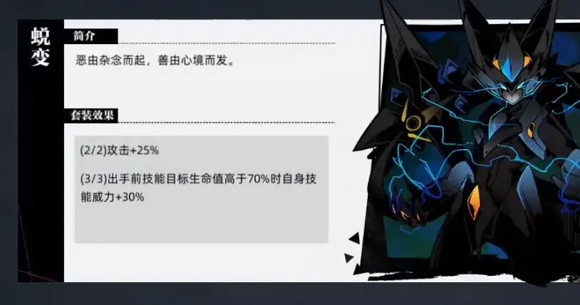 2技能全体伤害,给生命低的角色加闪避,概率给自己加免疫弱化;极限特质的2技能,如果我方有闪避状态的角色使用2技能自身会获得加速buff。