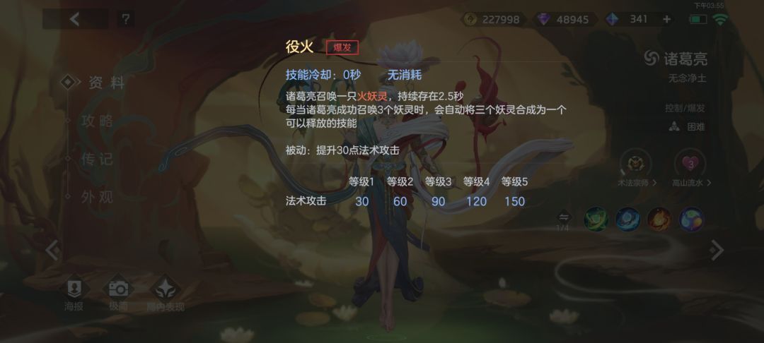 诸葛亮召唤一只火妖灵,持续存在2.5秒每当诸葛亮成功召唤3个妖灵时,会自动将三个妖灵合成为一个可以释放的技能。