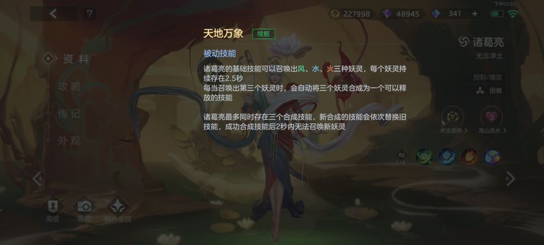诸葛亮的基础技能可以召唤出风、水、火三种妖灵,每个妖灵持续存在2.5秒每当召唤出第三个妖灵时,会自动将三个妖灵合成为一个可以释放的技能诸葛亮最多同时存在三个合成技能,新合成的技能会依次替换旧技能,成功合成技能后2秒内无法召唤新妖灵。
