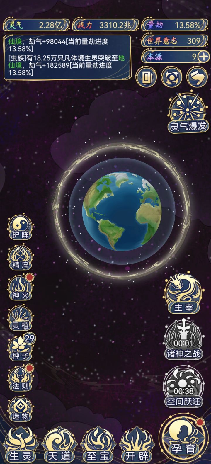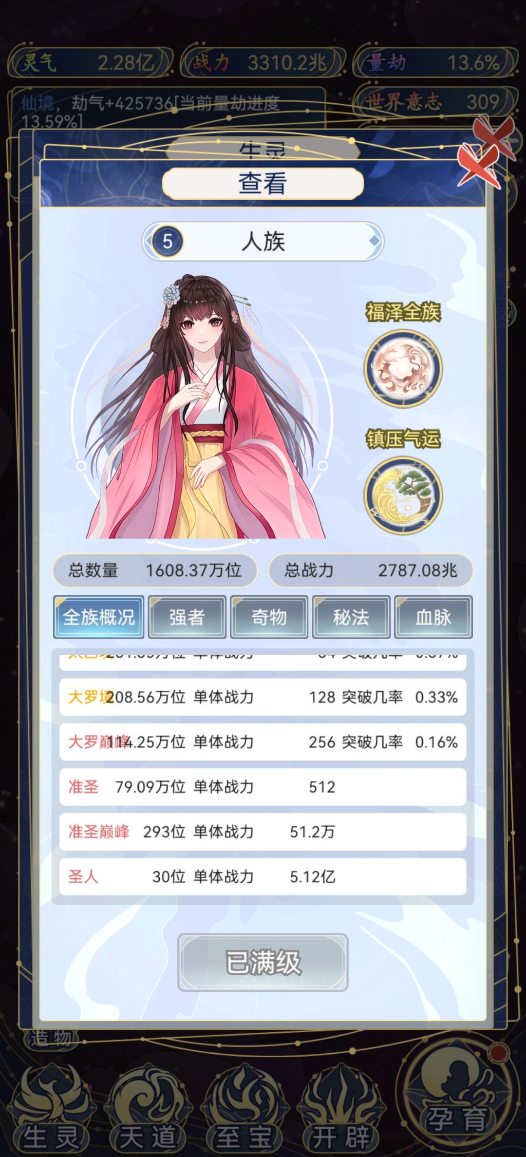 前期发展单种族,把血脉和强者集中在一个种族身上,战力提升快。再努力攒世界意志,进入大千世界后就可以发展全种族了,这是迟早的事。每个种族都有上限的,等你把各种族科技树和宝物等级全部升满之后,本源的消耗就下降一大截了,再努力刷人口和域外征战,福佑各种族,战力慢慢就提升起来了。后期就是看广告、空间跃迁、灵气转化本源、灵气刷人口、域外征战、刷圣人…