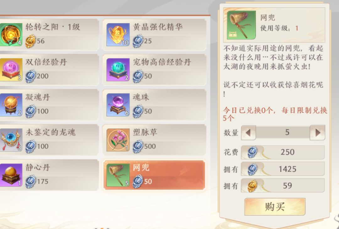 首先我们需要准备的就是截图中的这个网兜了,不知道的小伙伴,可以打开侠义兑换商店,手动翻页到中间的一栏,就可以看到网兜这个道具了,50侠义一个网兜,我们一天貌似最多可以刷200点普通的侠义,这玩意每天可以换5个,一共是250侠义,所以还是很便宜的。