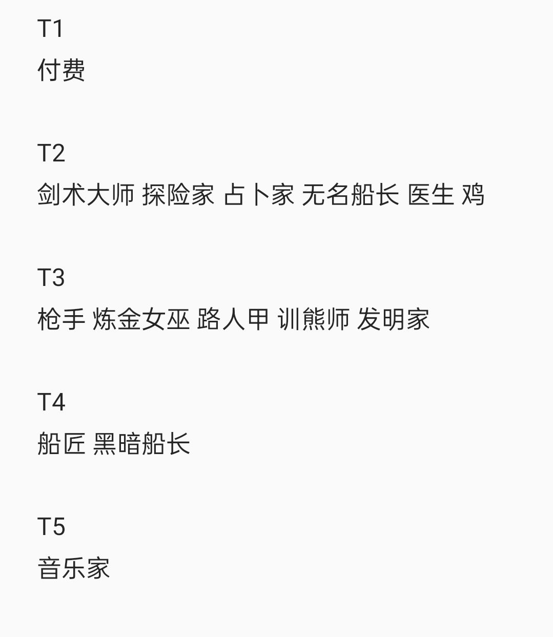 t1总督,枪手,剑术,音乐家,占卜师