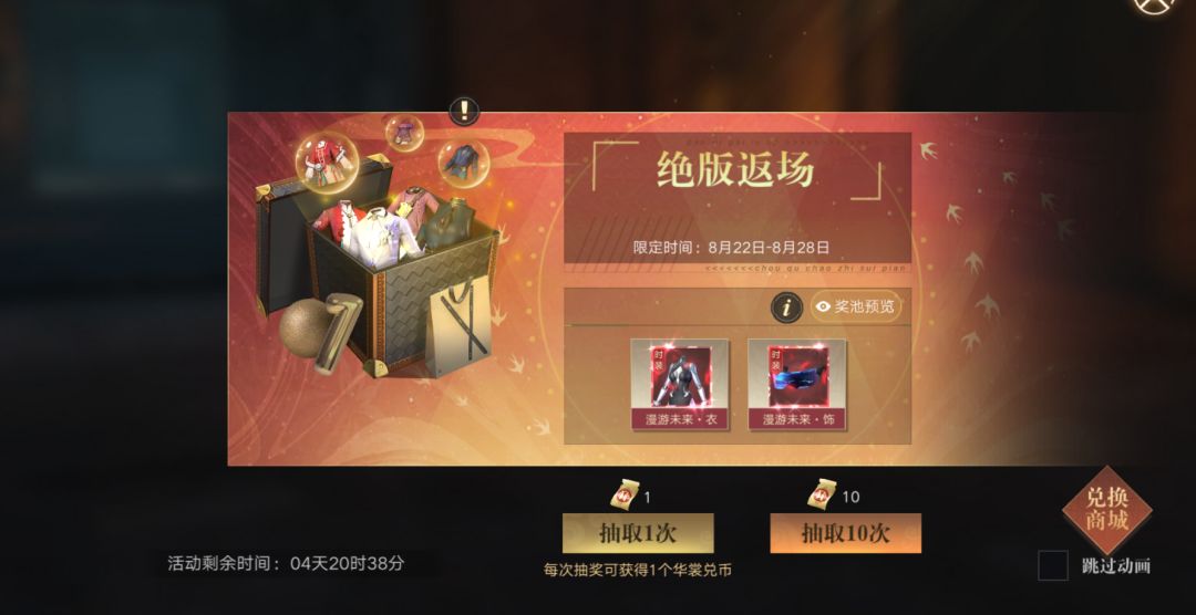 绝版时装——漫游未来返场,2000蓝钻=1华裳之券,奖池中不仅有绝版时装,更有三转载具核心自选箱等等珍贵道具,抽中华裳代币更能前往兑换商城购买精美商品!