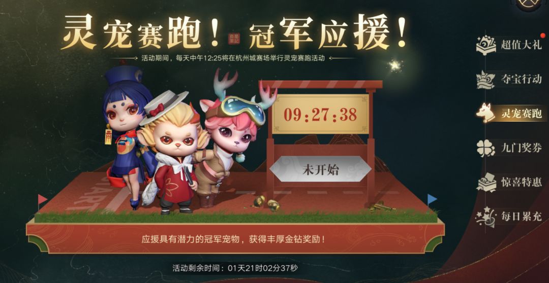 每日更新福利活动:【灵宠赛跑!冠军应援!】,选择你中意的冠军灵宠,有机会获得丰厚的金钻奖励哦~