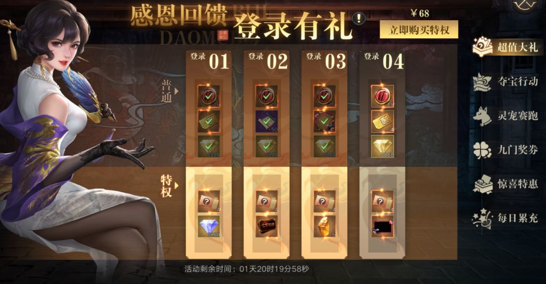 充值满68元,赠送七夕兑币*60、阴阳符*1、田黄石*2、九门奖券*5