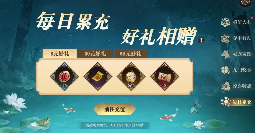 充值满6元,赠送七夕兑币*10、阴阳符*1、历练时间*200、九门奖券*2