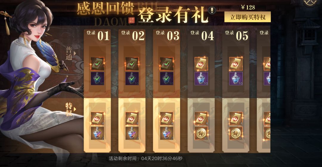 登录7天总计获得华裳之券*7、基础染色剂*70,购买特权额外赠送华裳之券*28、精品染色剂*6、华裳兑币*90、蓝钻*12800。