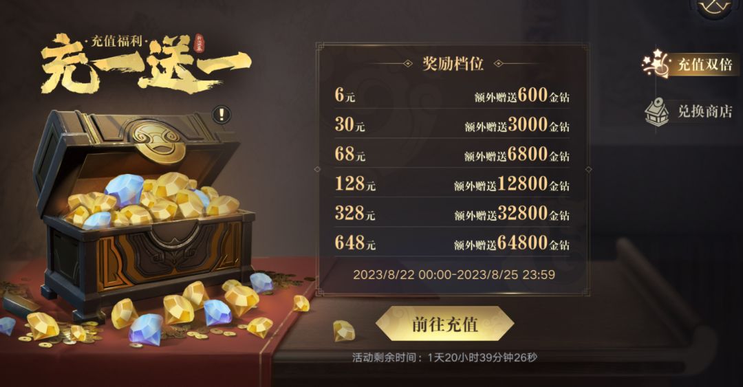 活动期间,充一送一!买多少蓝钻送多少金钻!想要充值就是现在!